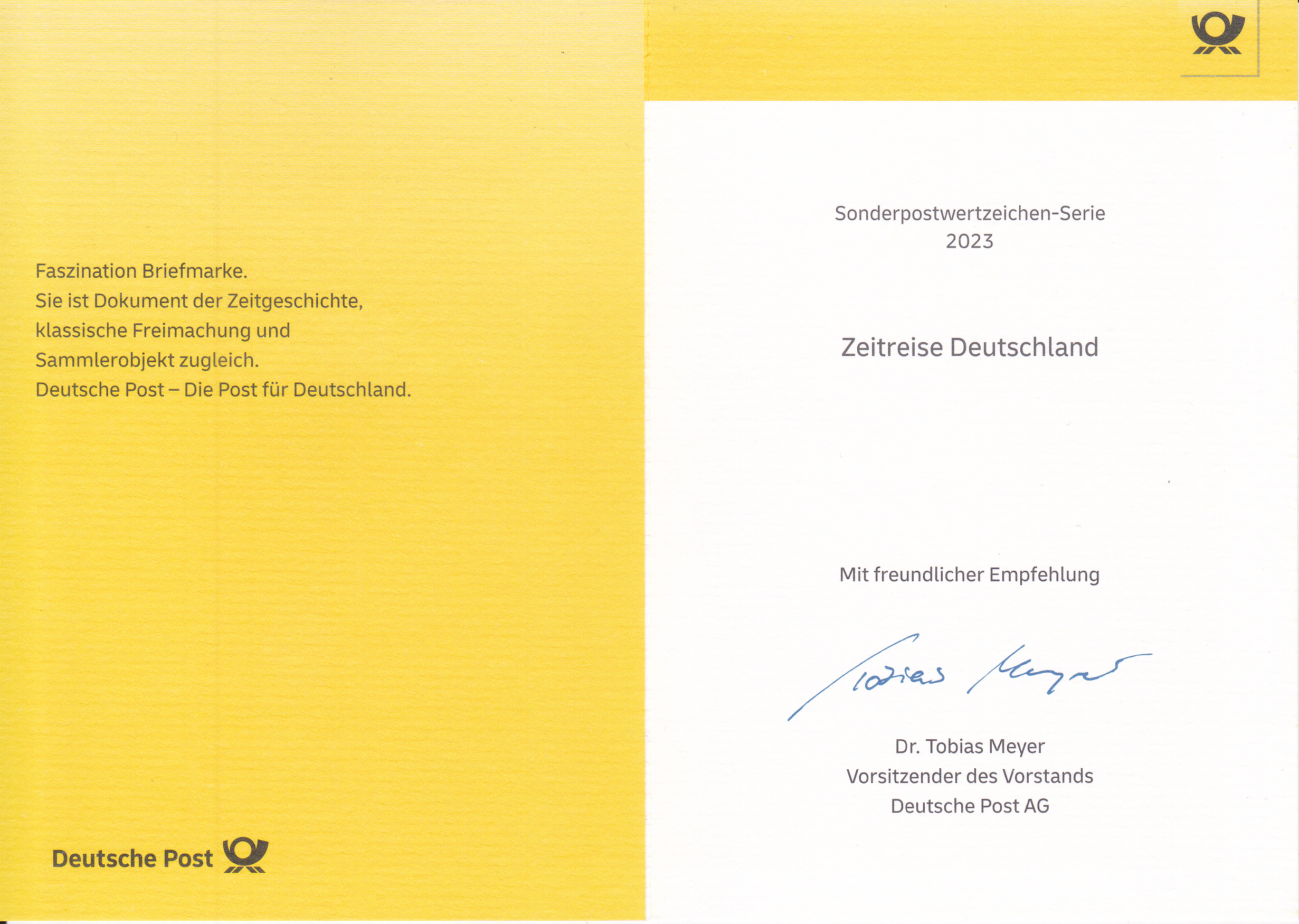 Klappkarte des Vorstandsvorsitzenden der Deutschen Post AG mit einer Marke (MiNr 3788) zum 100. Geburtstag von Otfried Preußler (1923-2013; böhmischer Kinder- und Jugendbuchautor) und dem Ersttagsonderstempel Bonn.