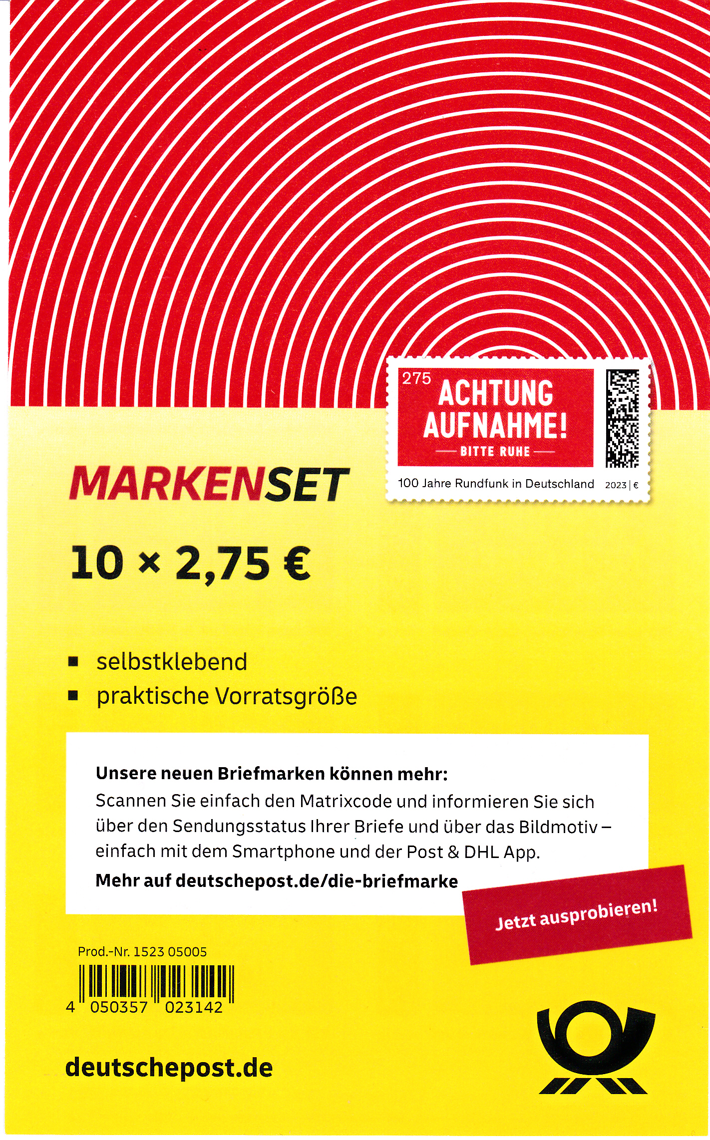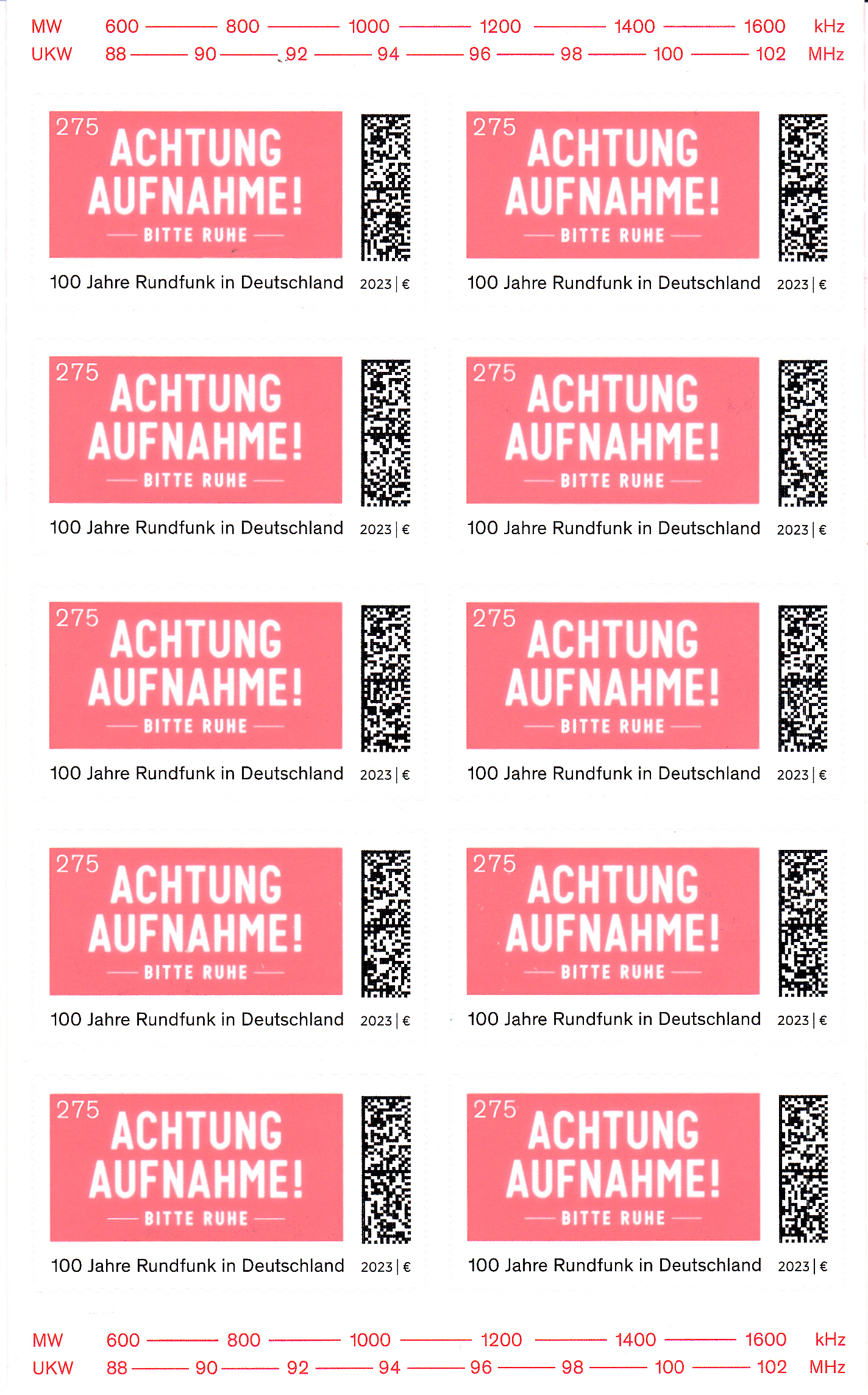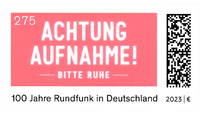 Bei der Deutschen Post erschien diese Marke (MiNr 3790) zum Jubiläum mit der Inschrift "Achtung Aufnahme! Bitte Ruhe" auf orangerotem Schild.