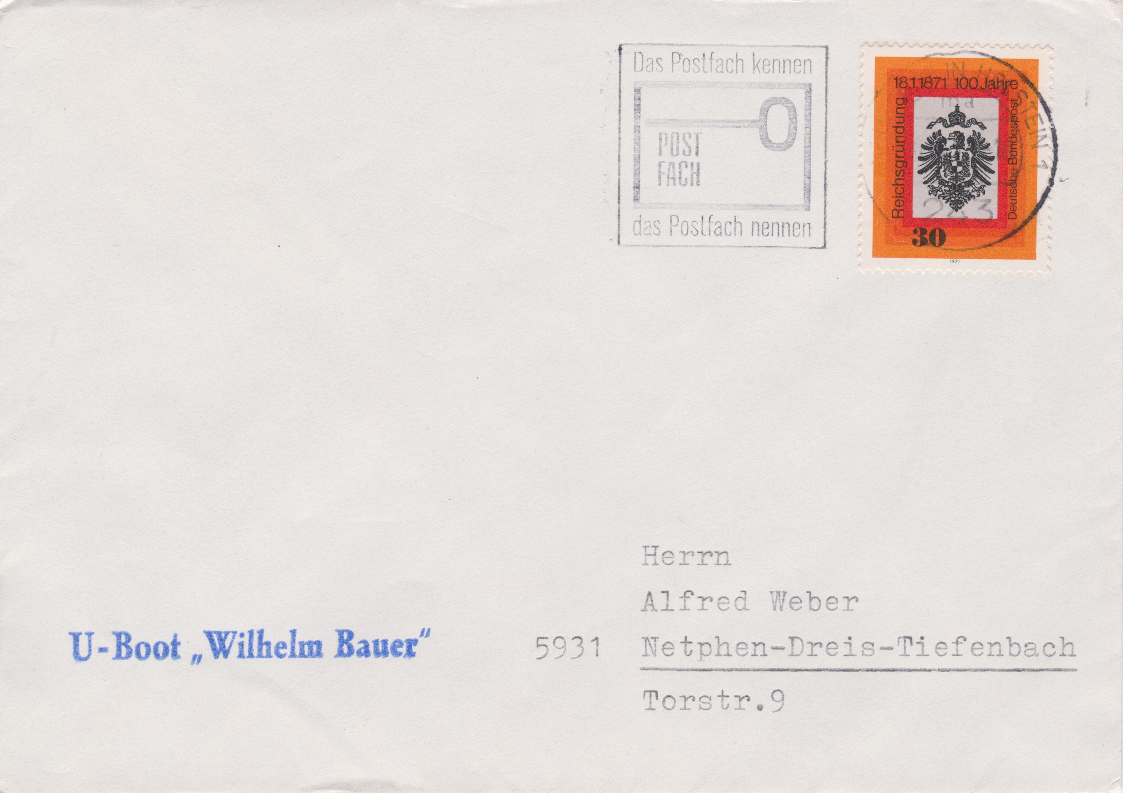 U 2540 (selbstversenkt am 4. Mai 1945, gehoben im Juni 1957) wurde 1960 in die Bundesmarine als Wilhelm Bauer übernommen, verblieb zunächst bis 1968 in Dienst und wurde dann nochmal von 1970 bis 1982 als Testboot genutzt, was der Cachetstempel auf diesem Beleg dokumentiert: