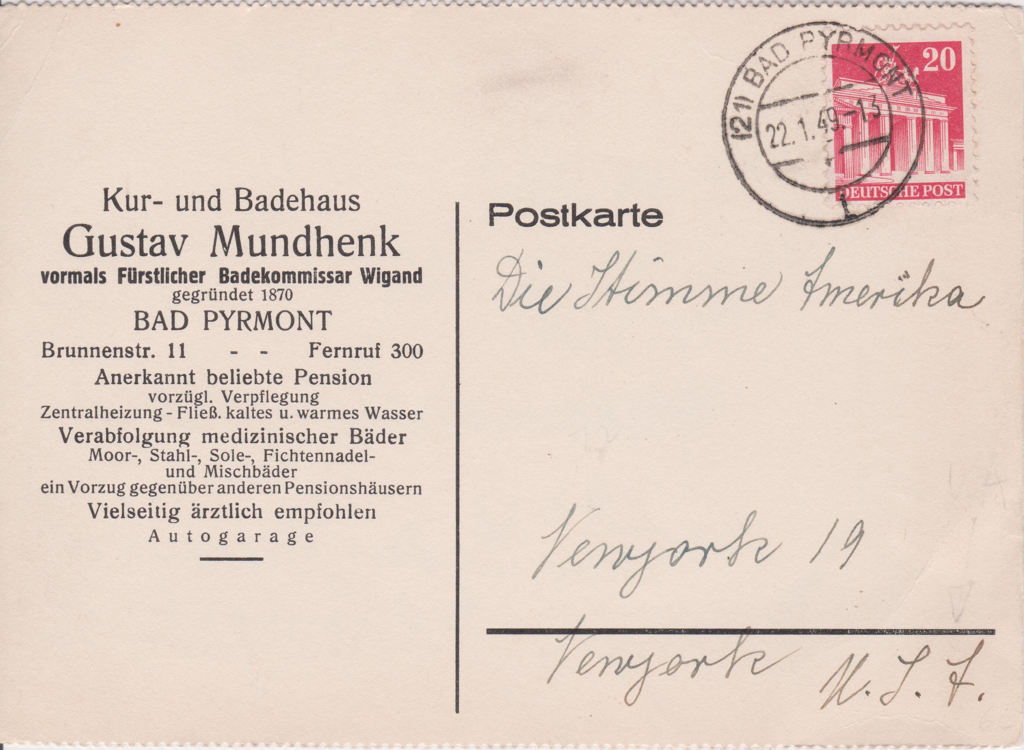 Einzelfrankatur 20 Pf, MiNr. 85, auf Postkarte in die USA, aufgegeben am 22.01.1949 in (21) BAD PYRMONT:
