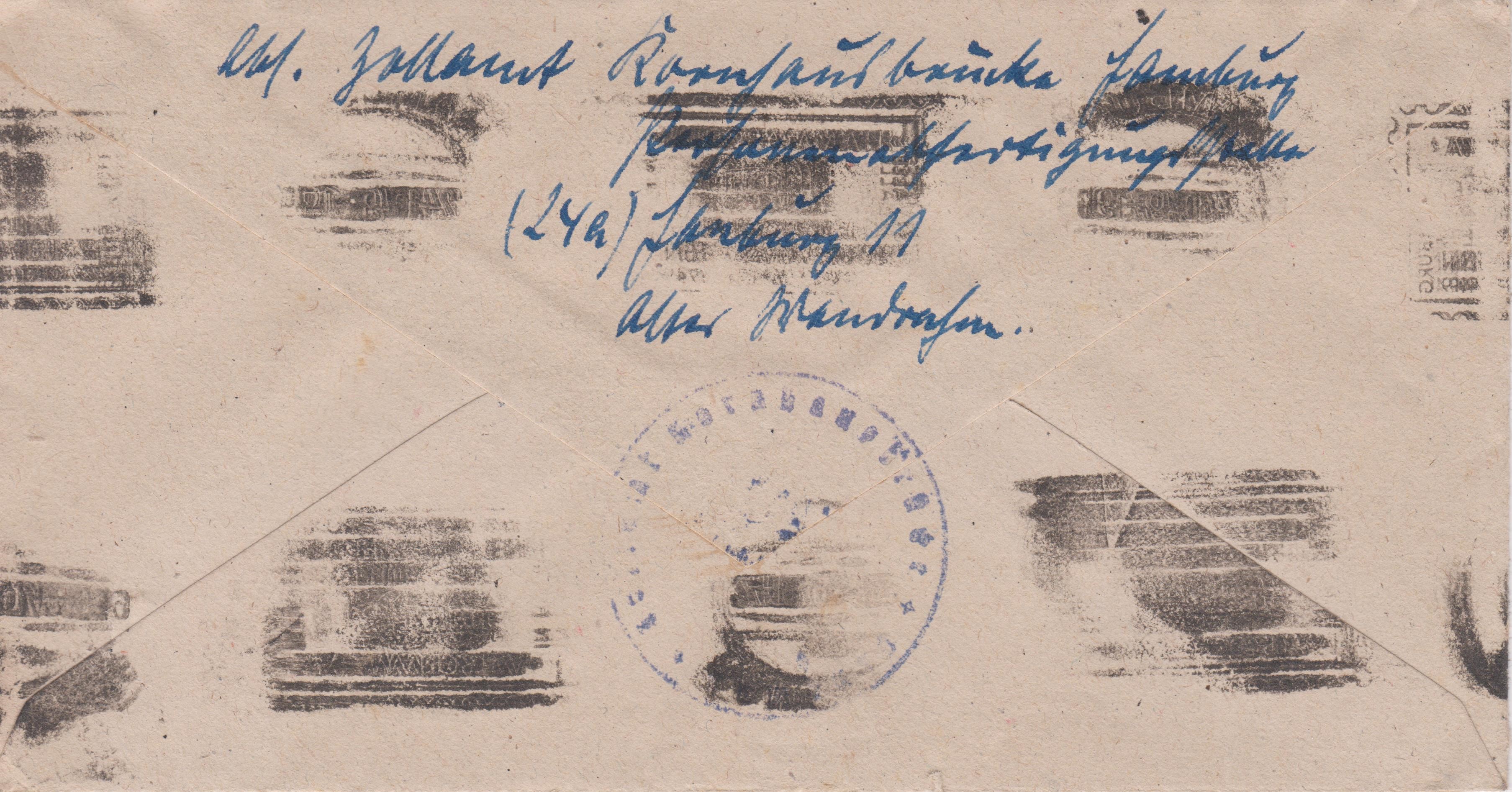 Einzefrankatur 20 Pf Bautenserie, nach links dezentriert, am 24.10.1949 portogerecht auf Brief im Fernverkehr von HAMBURG nach Emmerich: