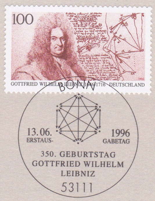 Zum 350. Geburtstag von Gottfried Wilhelm erschien bei der Deutschen Post eine Marke (MiNr 1865) mit seinem Porträt. Hier zeige ich eine Marke mit dem Ersttagsonderstempel Bonn.