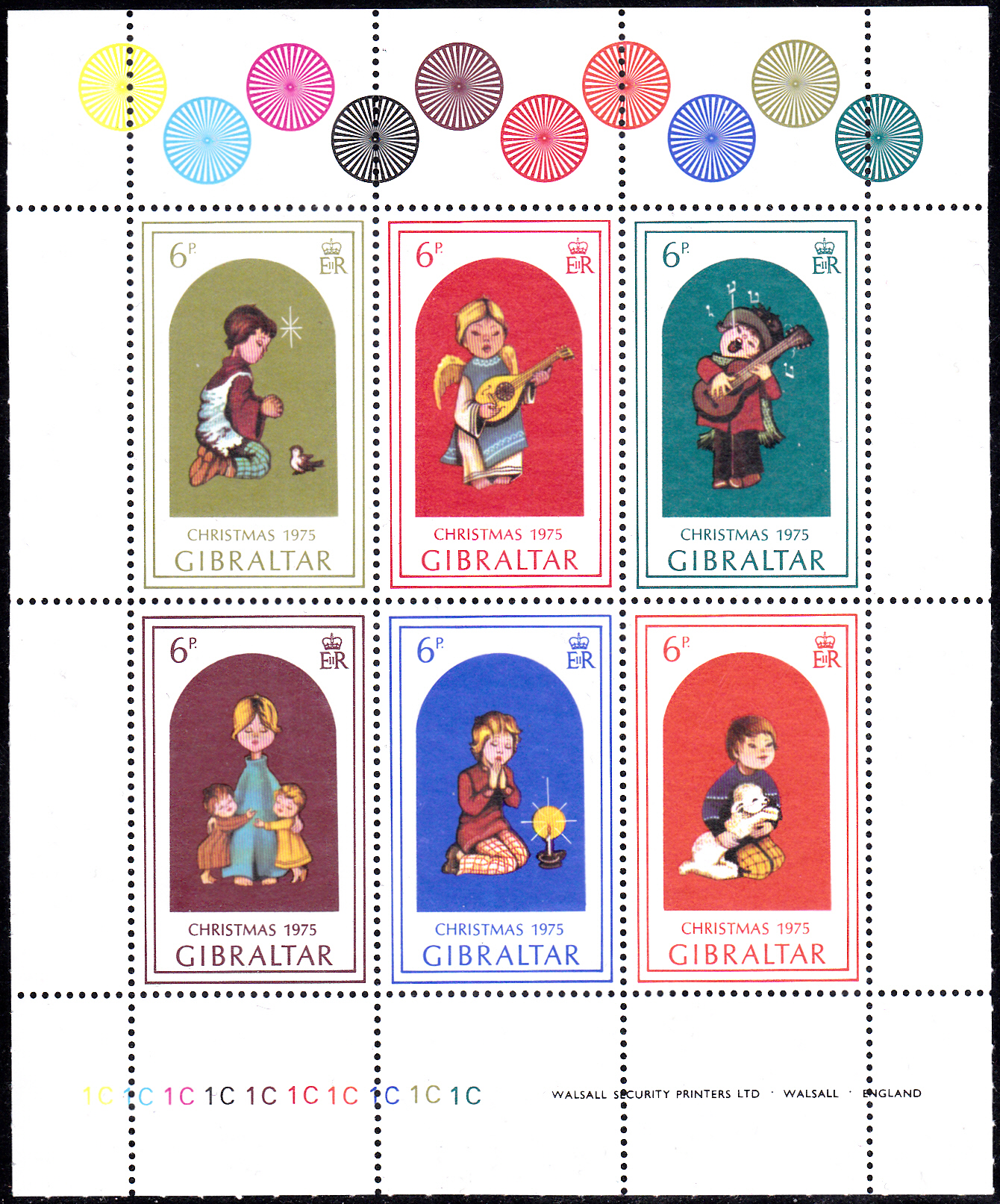 Die sechs Marken der Weihnachtsmarken 1975 wurden zusammen in einem Kleinbogen gedruckt. Am unteren Ende des Bogen befindet sich die Plattennummer, hier "1C".