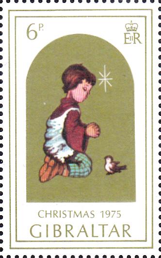 Zu Weihnachten 1975 sind insgesamt sechs Marken erschienen. Hier zeige ich die Marke MiNr 328 mit einem betenden Kind und einem Vogel.