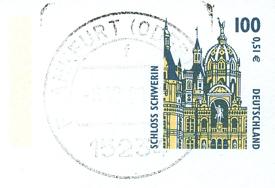 Dieses Exemplar wurde am 30.12.2005 als Standardbrief (0,55 €) per Übergabeeischreiben (2,05 €) freigemacht mit einer Zusatzfrankatur von einem Wert SWK zu 2,00 €, MiNr. 2314 xaII, mit Sicherheitsaufdruck IV = Aufdruck bis an die Zähnung gehend, in der Mitte freies Rechteck, sowie einem Wert SWK in Doppelnominale zu 10 (Pfennig) 0,05 €, MiNr. 2139 AR, mit Sicherheitsaufdruck I = vom Aufdruck ausgespart sind Zähnung, Bildteile, Schrift und Ziffern:
