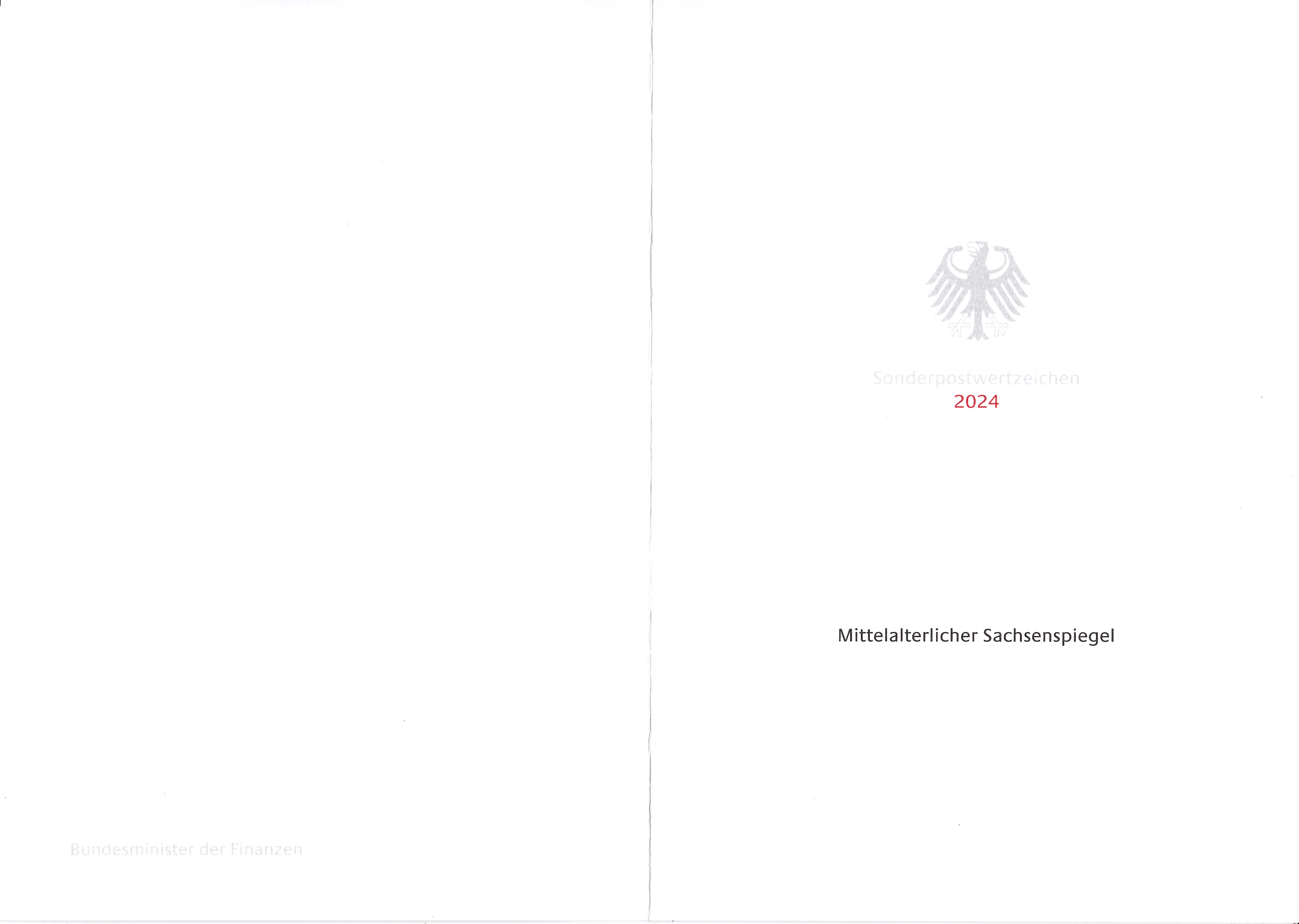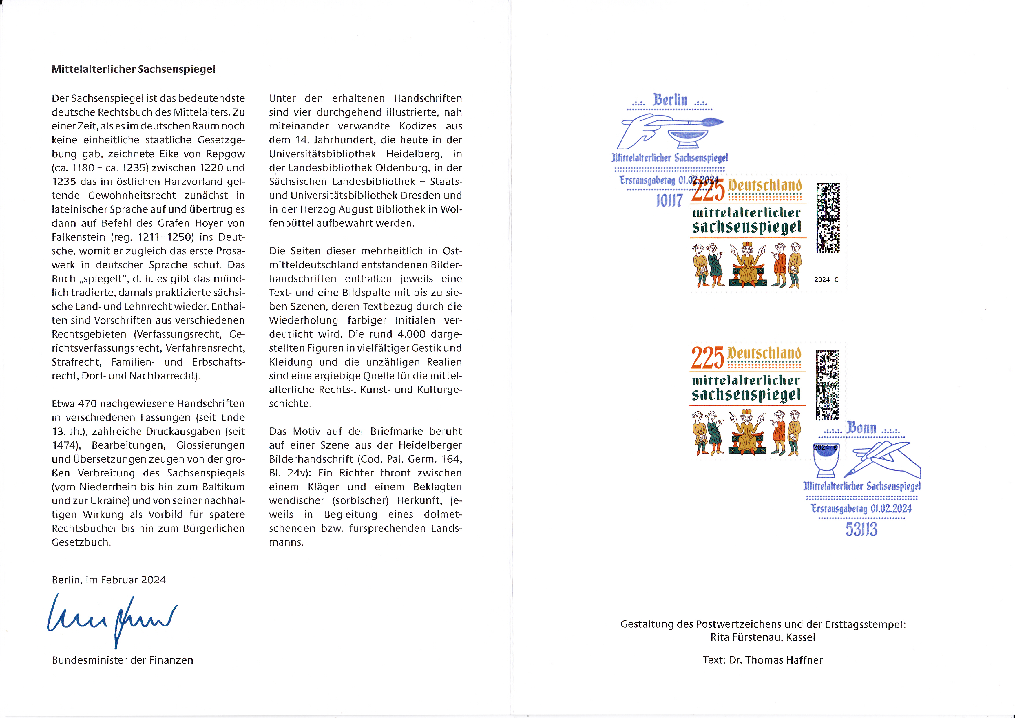 Ministerkarte des Bundesministers für Finanzen mit zwei Marken (MiNr 3815) "Mittelalterlicher Sachsenspiegel" und den beiden Ersttagsonderstempel Bonn und Berlin.