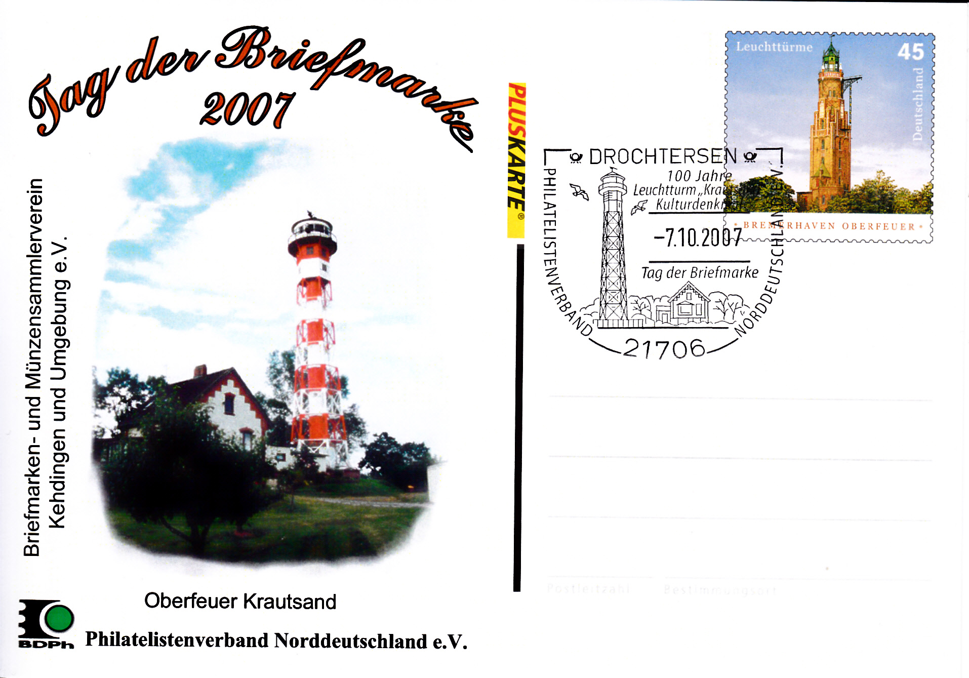 Ganzsachenpostkarte des Philatelistenverbandes Norddeutschland e.V. zum Tag der Briefmarke 2007 mit dem dazu passenden Sonderstempel vom 7.10.2007 aus Drochtersen.