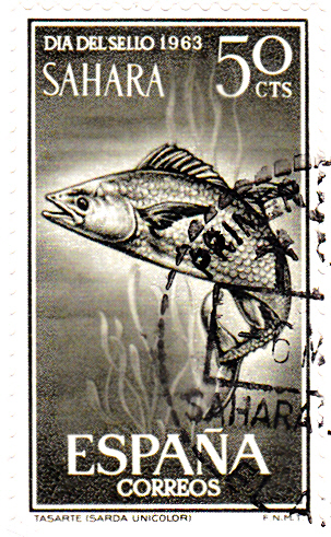 In Spanisch-Sahara erschien diese Marke zum Tag der Briefmarke 1963 mit der Abbildung eines Ungestreiften Pelamide (Orcynopsis unicolor).