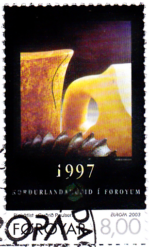 In Dänemark Färöer erschienen die Europamarken 1993 zum Gemeinschaftsthema "Plakatkunst" am 14. April 1993. Hier zeige ich die Marke zu 8,00 Kronen mit einem Werbeplakat für das Haus des Nordens in Tórshavn (1997) von Guðrið