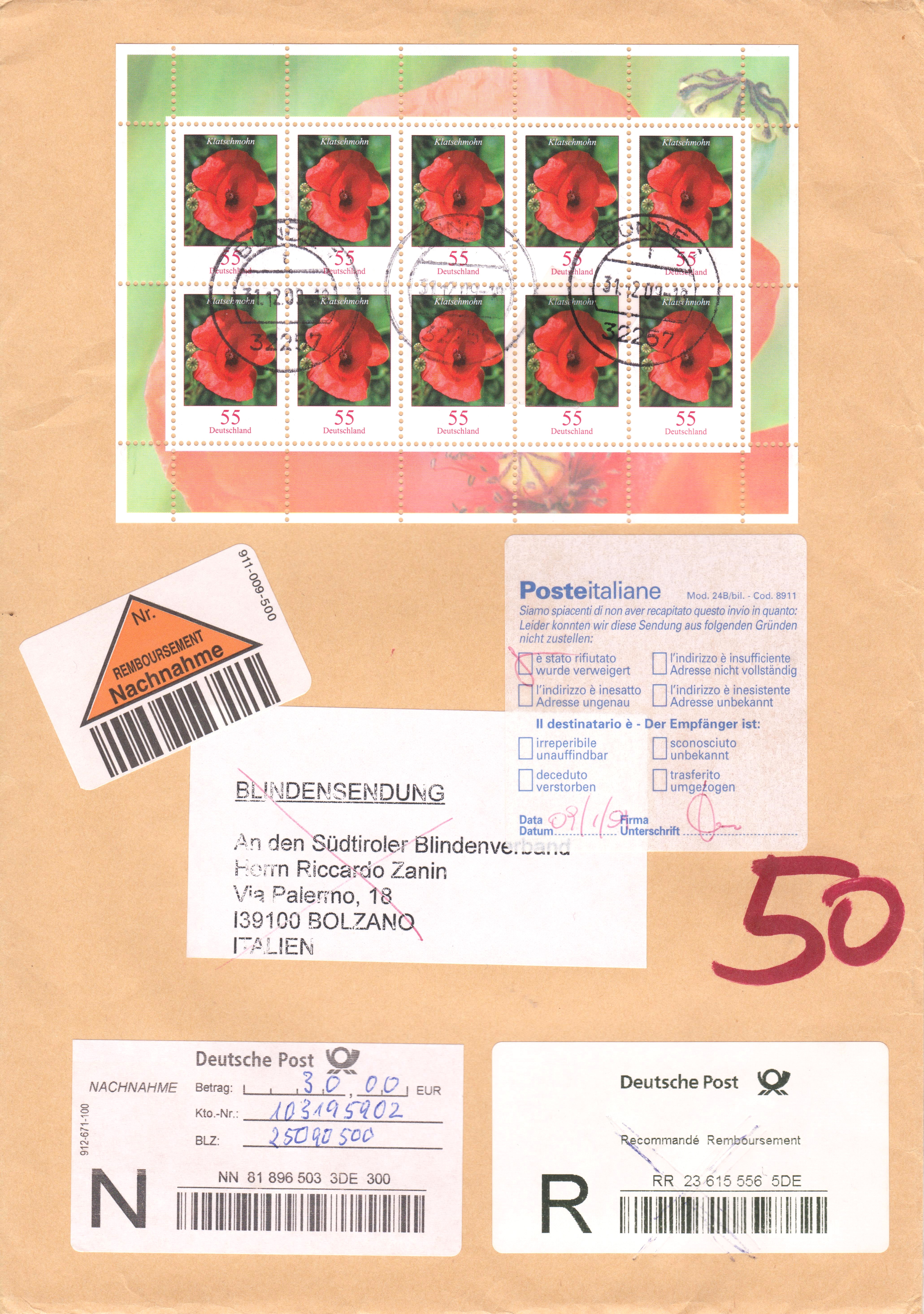 Zehnerbogen der Wertstufe 55 Cent am 31.12.2009 auf BLINDENSENDUNG per Einschreiben mit Nachnahme nach Italien: