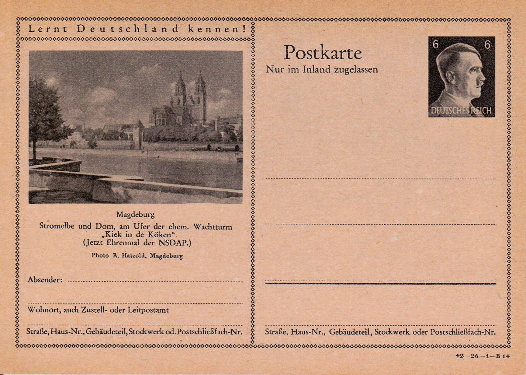 Auf dieser Bildpostkarte 1942 (MiNr P307 Serie 26 Bild 13) ist das Elbufer und dem Magdeburger Dom abgebildet.
