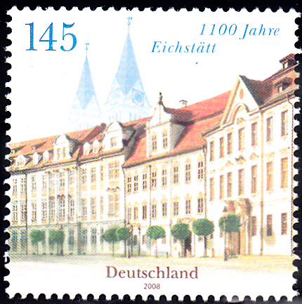 Auf der Marke "1100 Jahre Eichstätt" (MiNr 2638) sehen wir den Residenzplatz und im Hintergrund die beiden Türme des Domes in Eichstätt.