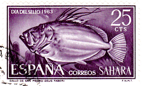 In Spanisch-Sahara (ehemalige spanische Kolonie in Nordwest-Afrika) erschien diese Marke zum Tag der Briefmarke 1963 mit der Abbildung des hier schon vorgestellten (St.) Petersfisch (Zeus faber), der auch Heringskönig, Sonnen-, Christus-, Martinsfisch oder Saint-Pierre genannt wird.