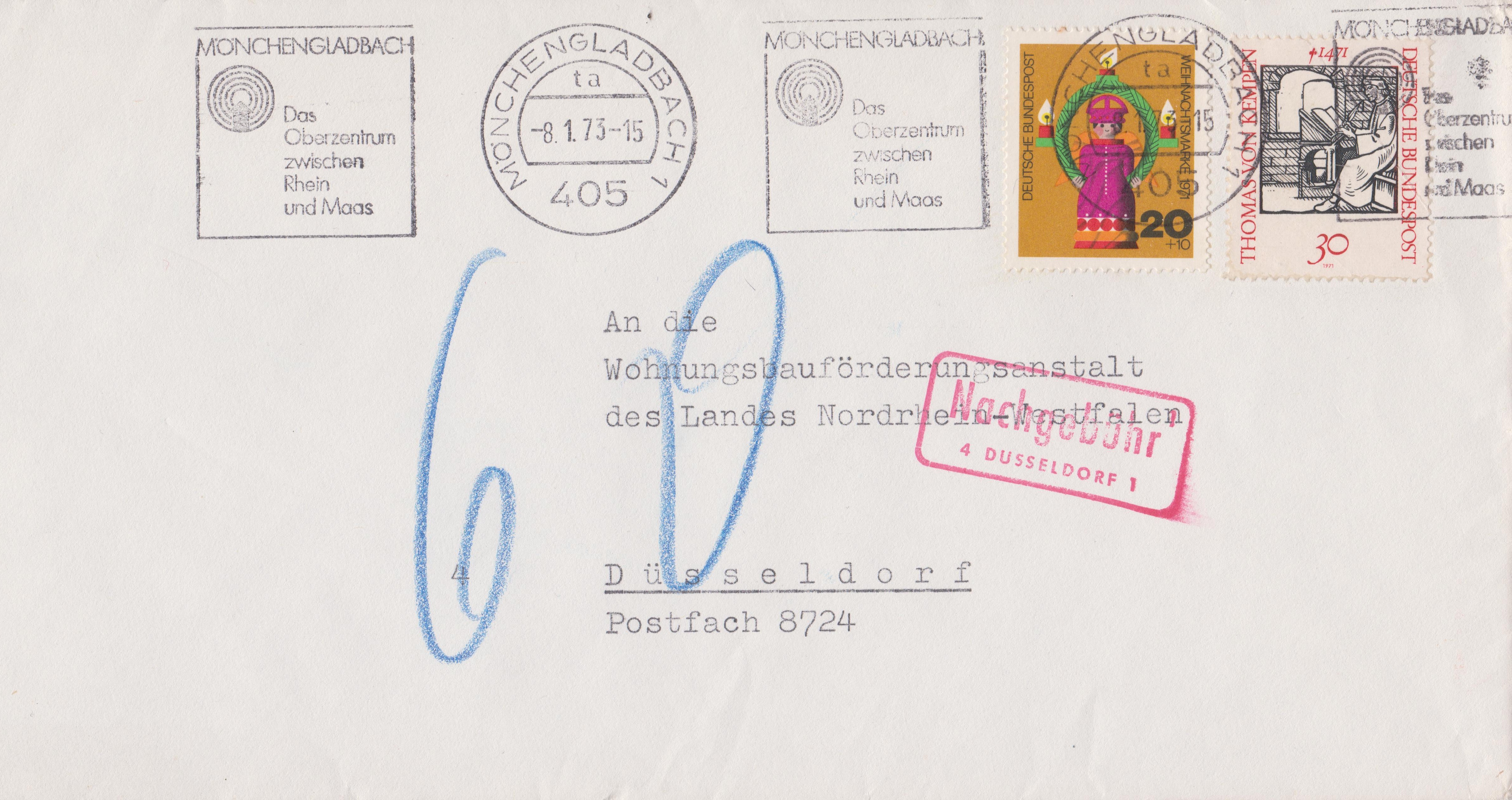 Dieser Brief im Fernverkehr von Mönchengladbach nach Düsseldorf wurde am 08.01.1973 mit 50 Pf freigemacht. Bei einem Gewicht von 21 - 50 g betrug das Porto für einen Brief im Fernverkehr 60 Pf. Der einfache Fehlbetrag von 10 Pf plus 50 Pf Einziehungsgebühr wurde als Nachgebühr erhoben.