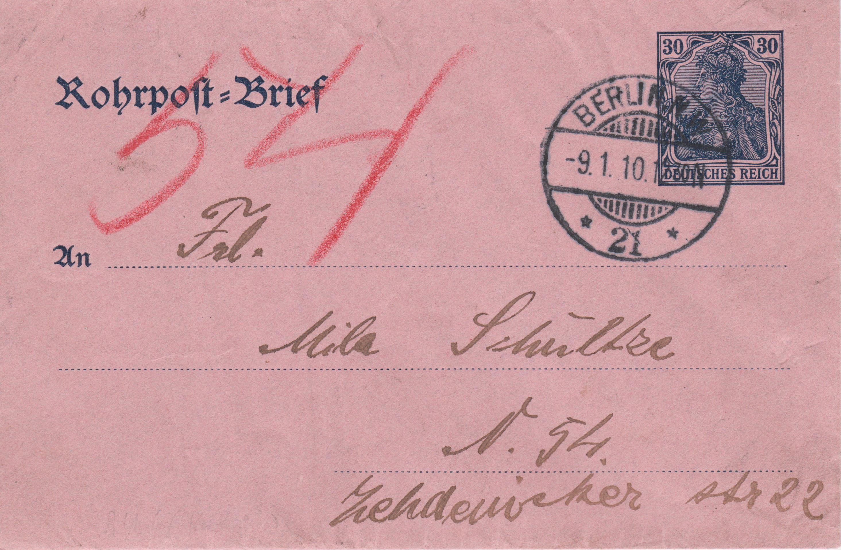 "Rohrpost=Brief", aufgegeben am 09.01.1910 in BERLIN, N. W. 21, per Rohrpost befördert nach "N 54":