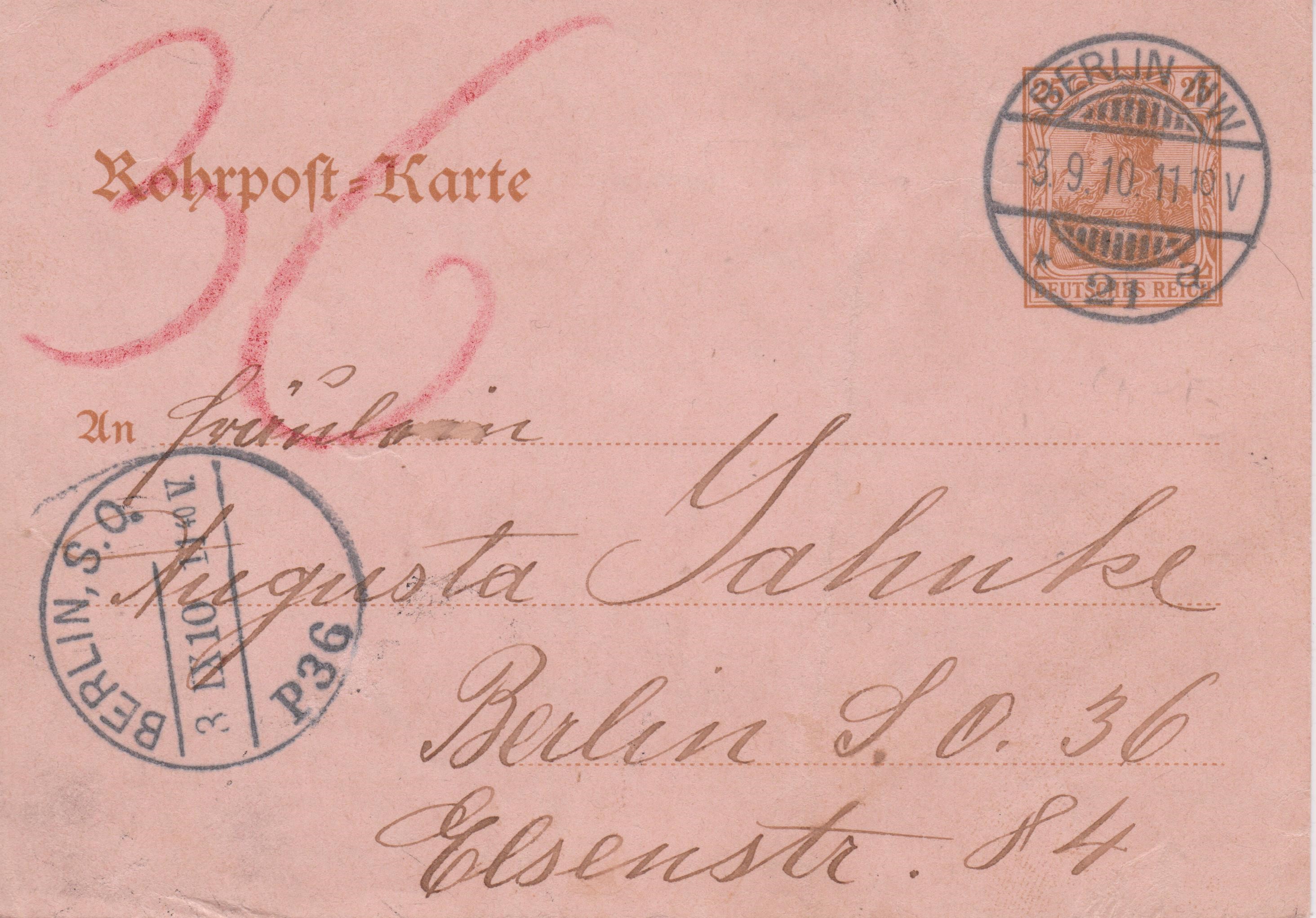 "Rohrpost=Karte", aufgegeben am 03.09.1910 in BERLIN NW 21, per Rohrpost befördert nach "36" = BERLIN, S. O. P 36: