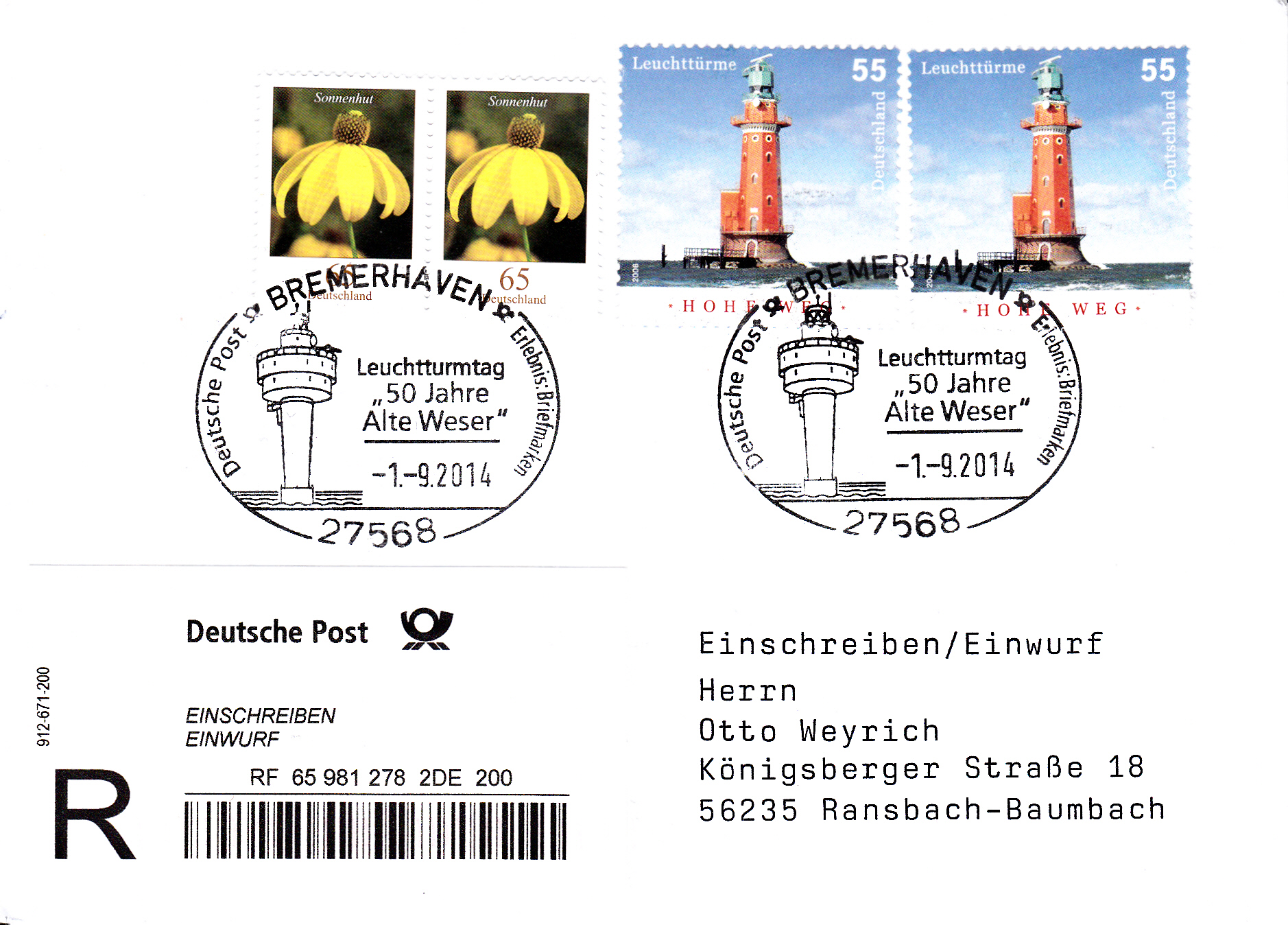 Einwurf-Einschreiben mit zwei Marken Leuchtturm Hörnum (MiNr 2613) und dem Sonderstempel vom 8.5.2013 aus Kiel mit einer Abbildung des Leuchtturmes Bülk in der Kieler Förde. Zur Frankaturergänzung sind noch zwei Marken der DS "Blumen" auf dem Brief verklebt worden.