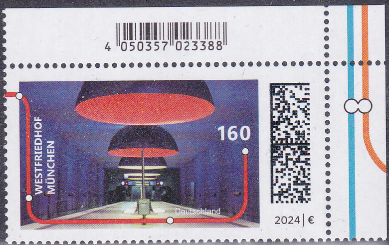 Bei der Deutschen Post ist 2024 eine Marke (MiNr 3807) erschienen mit einer Abbildung der U-Bahn-Haltestelle Westfriedhof in München. Hier zeige ich ein Eckrandstück mit EAN-Codierung.