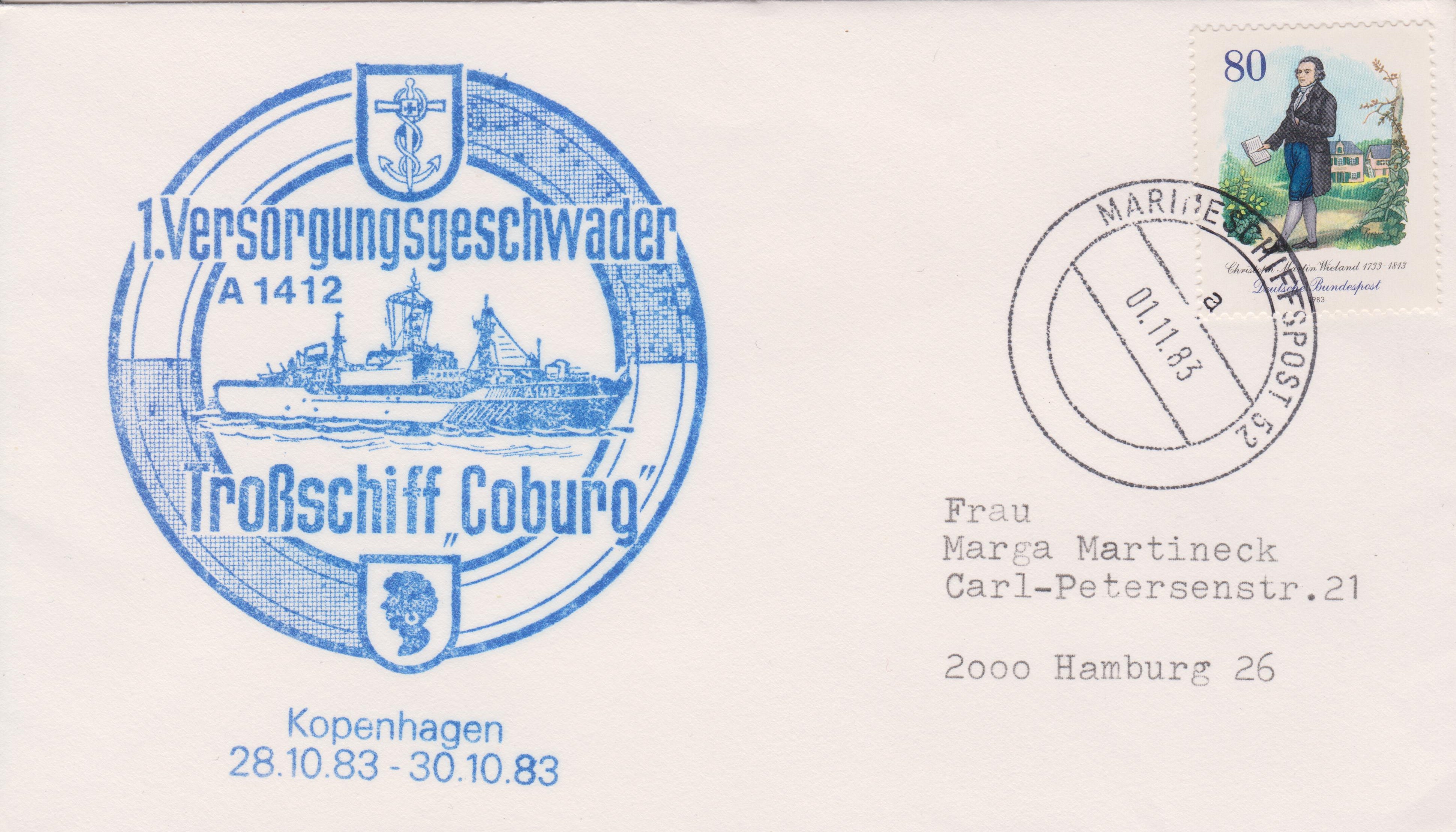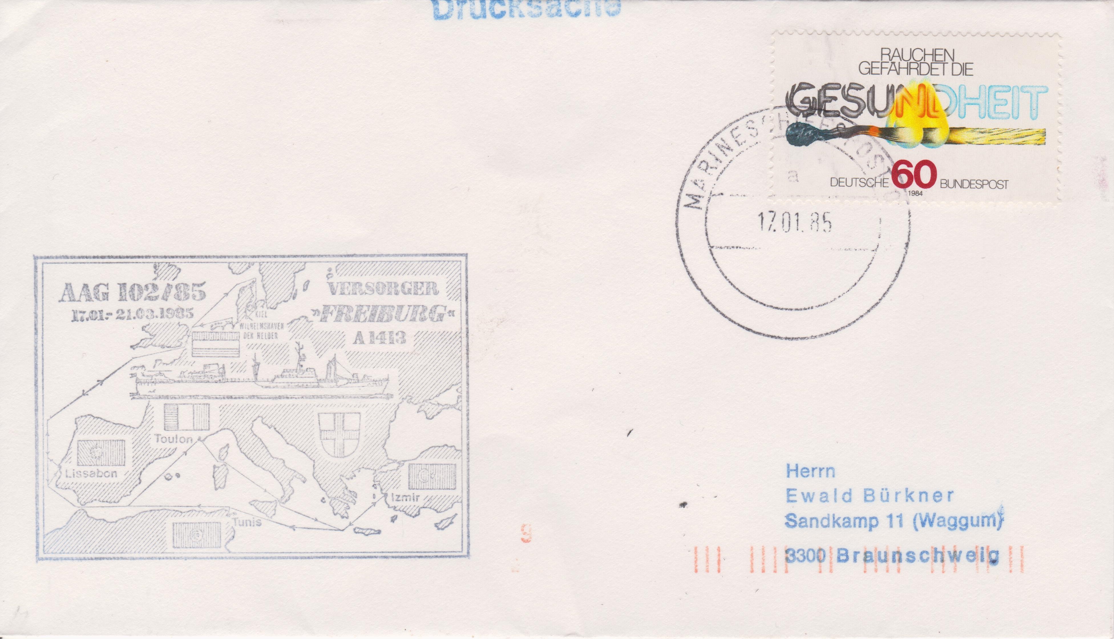 Belege vom TROSSSCHIFF FREIBURG A 1413 mit Tagesstempel MARINESCHIFFSPOST: