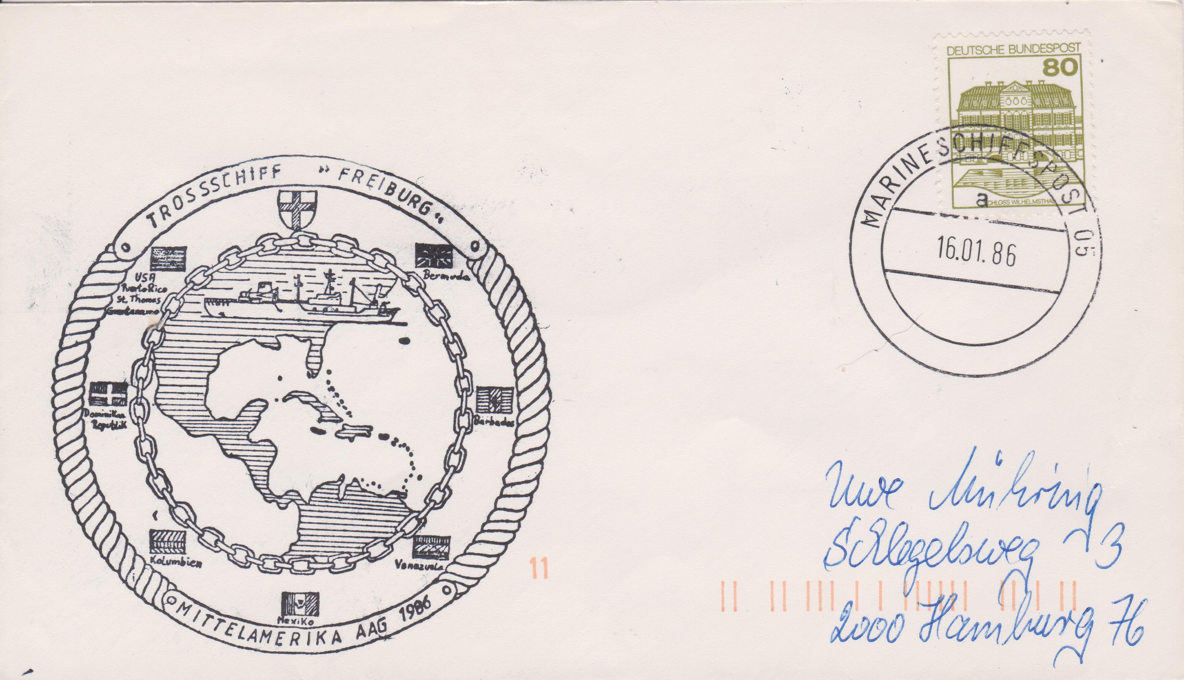 Belege vom TROSSSCHIFF FREIBURG A 1413 mit Tagesstempel MARINESCHIFFSPOST: