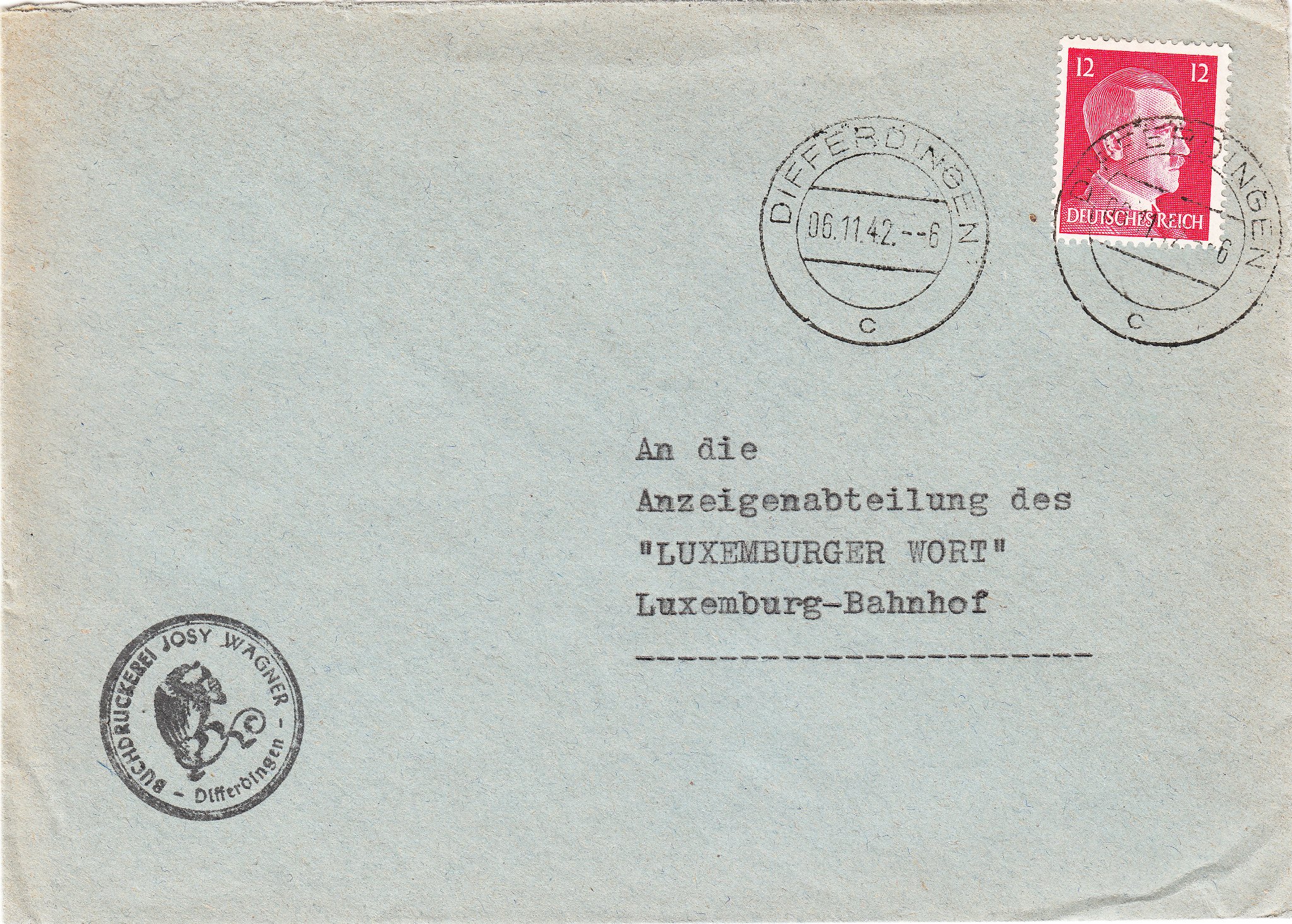Hier ein Fernbrief von DIFFERDINGEN nach Luxemburg vom 06.11.1942 mit einer portorichtigen EF der Wertstufe 12 Pfennig der Dauerserie Adolf Hitler:
