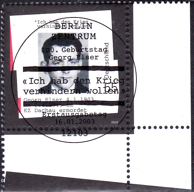 Zum 100. Geburtstag von Georg Elser ist eine Marke der Deutschen Post (MiNr 2310) mit seinem Porträt erschienen. Hier zeige ich ein postfrisches Eckrandstück.