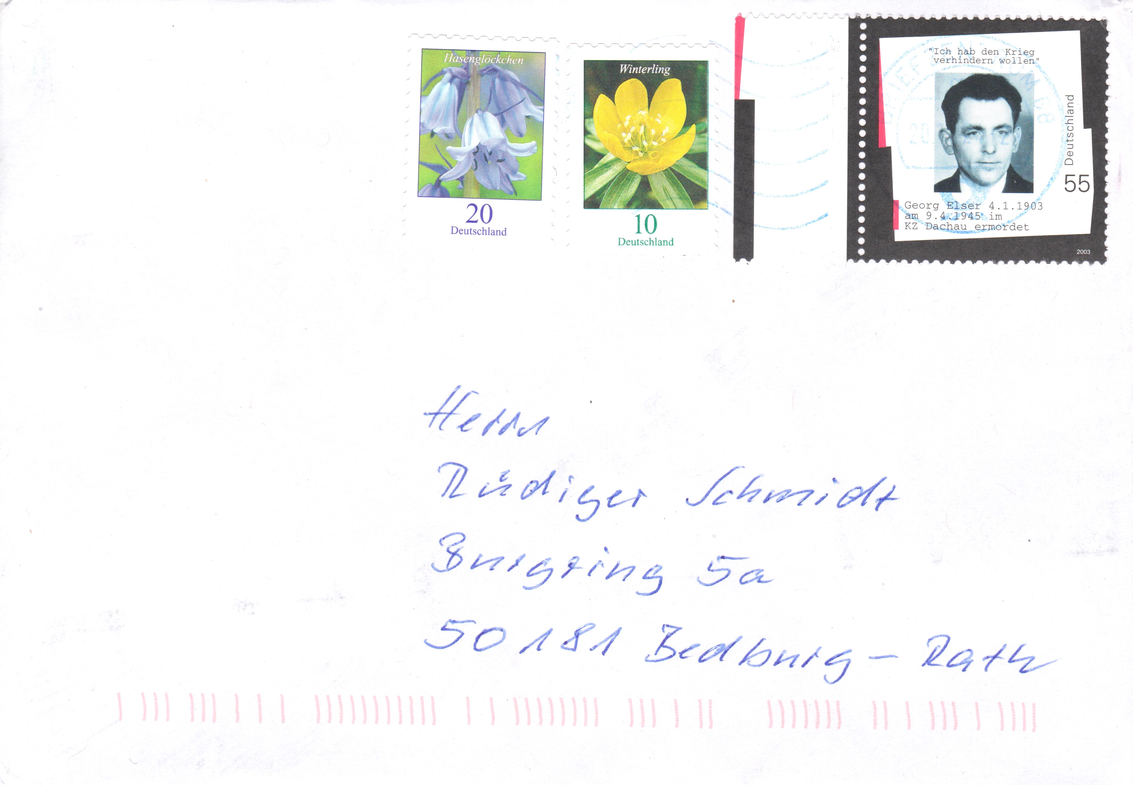 Zum 100. Geburtstag von Georg Elser erschien Deutschen Post MiNr 2310 mit seinem Porträt. Hier ein Brief der Portostufe 0,95 € vom 20.11.2024 mit einer Mischfrankatur: