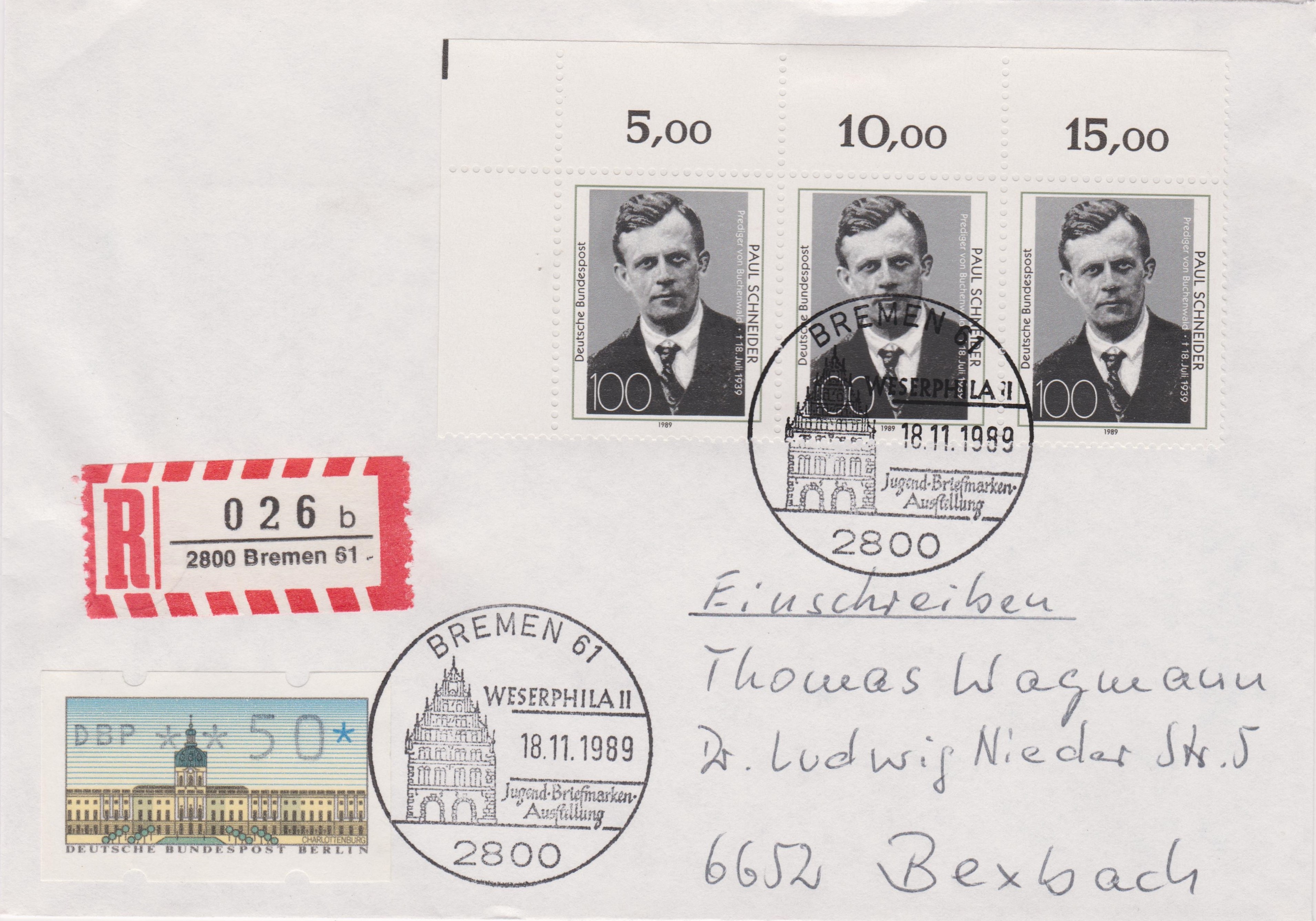 Es handelt sich um eine Mischfrankatur mit einer Automatenmarke "DEUTSCHE BUNDESPOST BERLIN", die auch in der Bundesrepublik Deutschland gültig war. Der Brief wurde portogerecht frankiert, denn ab dem 01.04.1989 kostete ein Standardbrief 100 Pfennig und die Einschreibegebühr betrug 250 Pf.