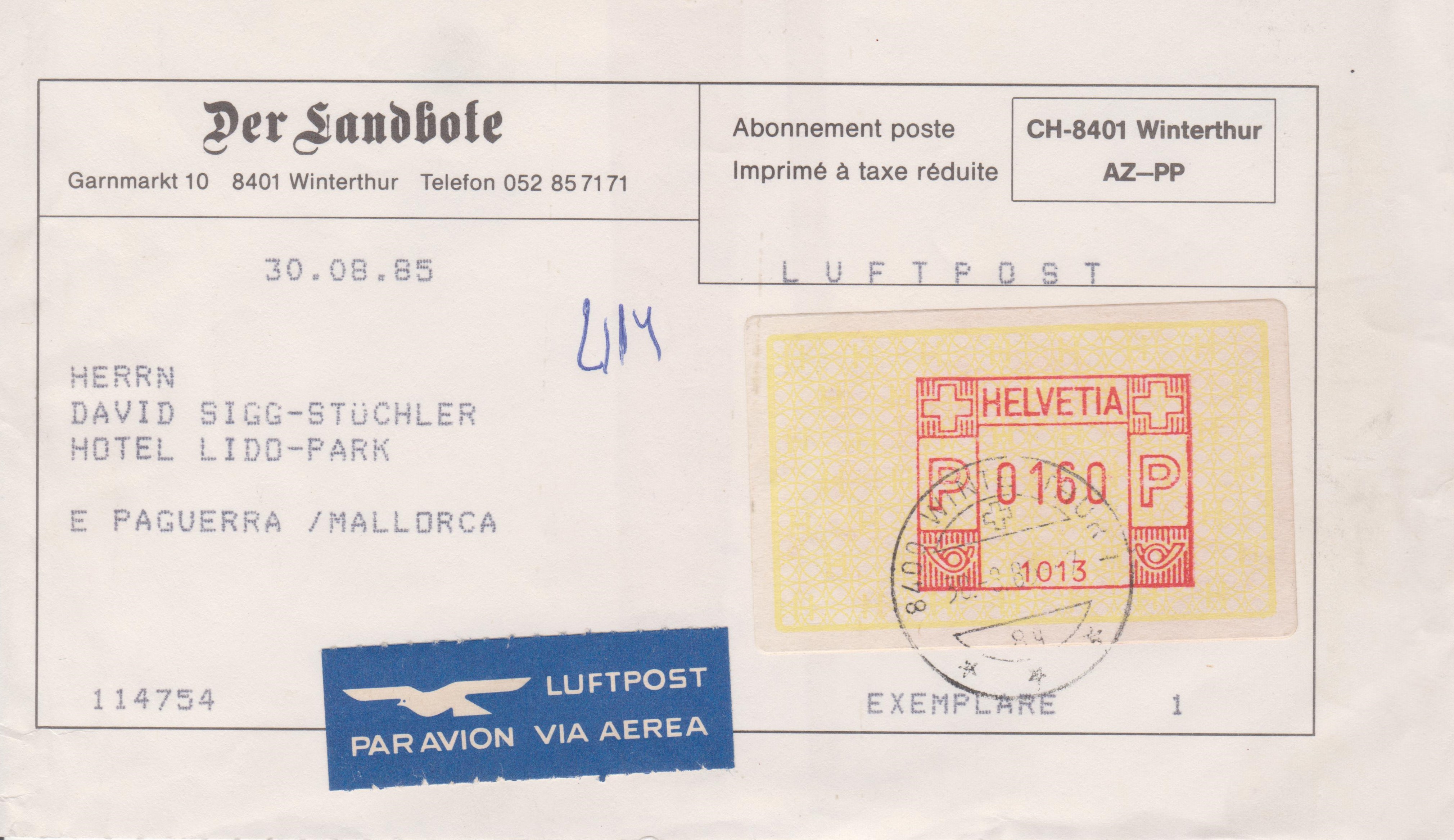 Streifband per Luftpost nach Mallorca, frankiert am 30.8.1985 mit einem selbstklebenden Label HELVETIA PP 1013 der Wertstufe 0160: