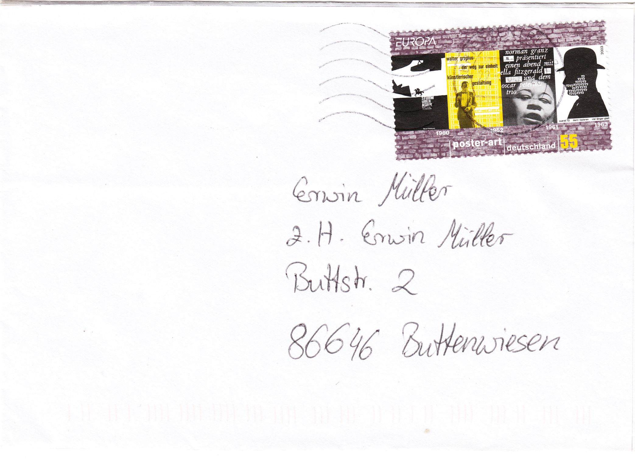 In Deutschland erschien eine Europamarke 2003 zum Gemeinschaftsthema "Plakatkunst" am 8. Mai 2003. Sie zeigt Plakate von Karl Oskar Blase (1925-2016), Michael Engelmann (1928-1966), Hans Georg Hillmann (1925-2014) und Günther Kieser (1930-2023) an einer Ziegelwand. Die Auflage der Marke betrug 30 000.000 Stück. Ich zeige hier ein postfrisches Eckrandstück der Marke.