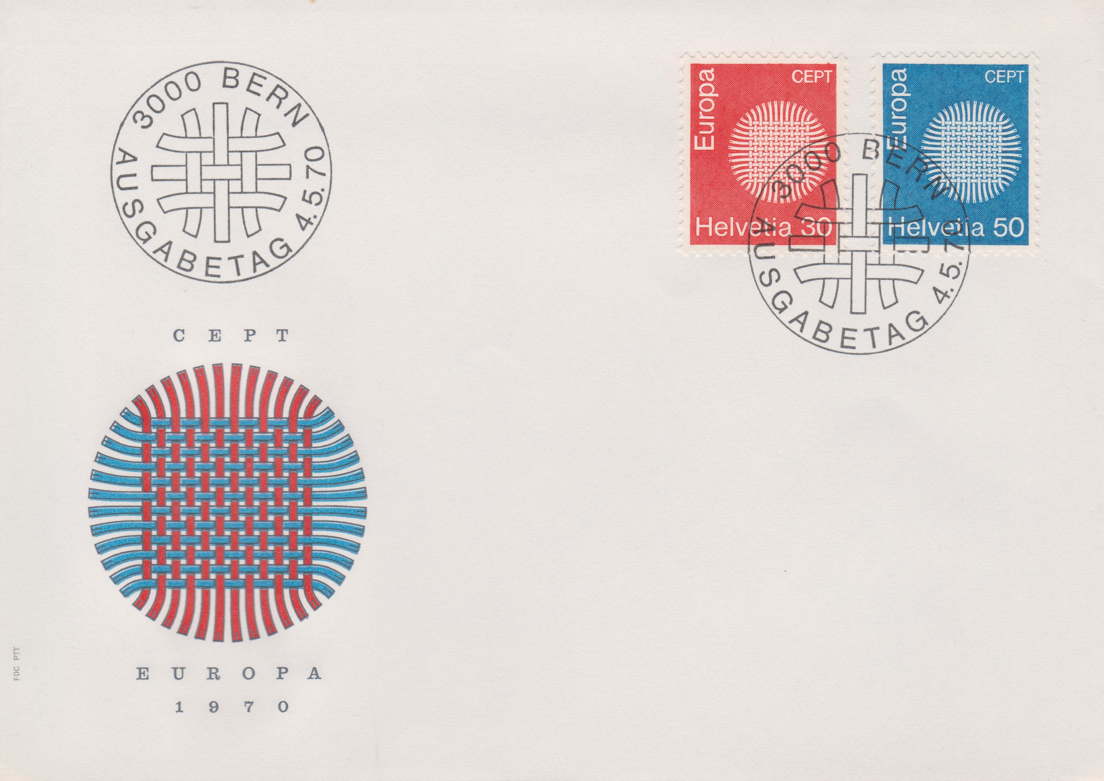In der Schweiz erschienen die Europamarken 1970 am 4. Mai 1970. Hier die Marke zu 50 Rappen dunkelkobalt mit dem Gemeinschaftsmotiv "Flechtwerk als Sonnensymbol", die in einer Auflage von 13 282 000 Stück erschien.