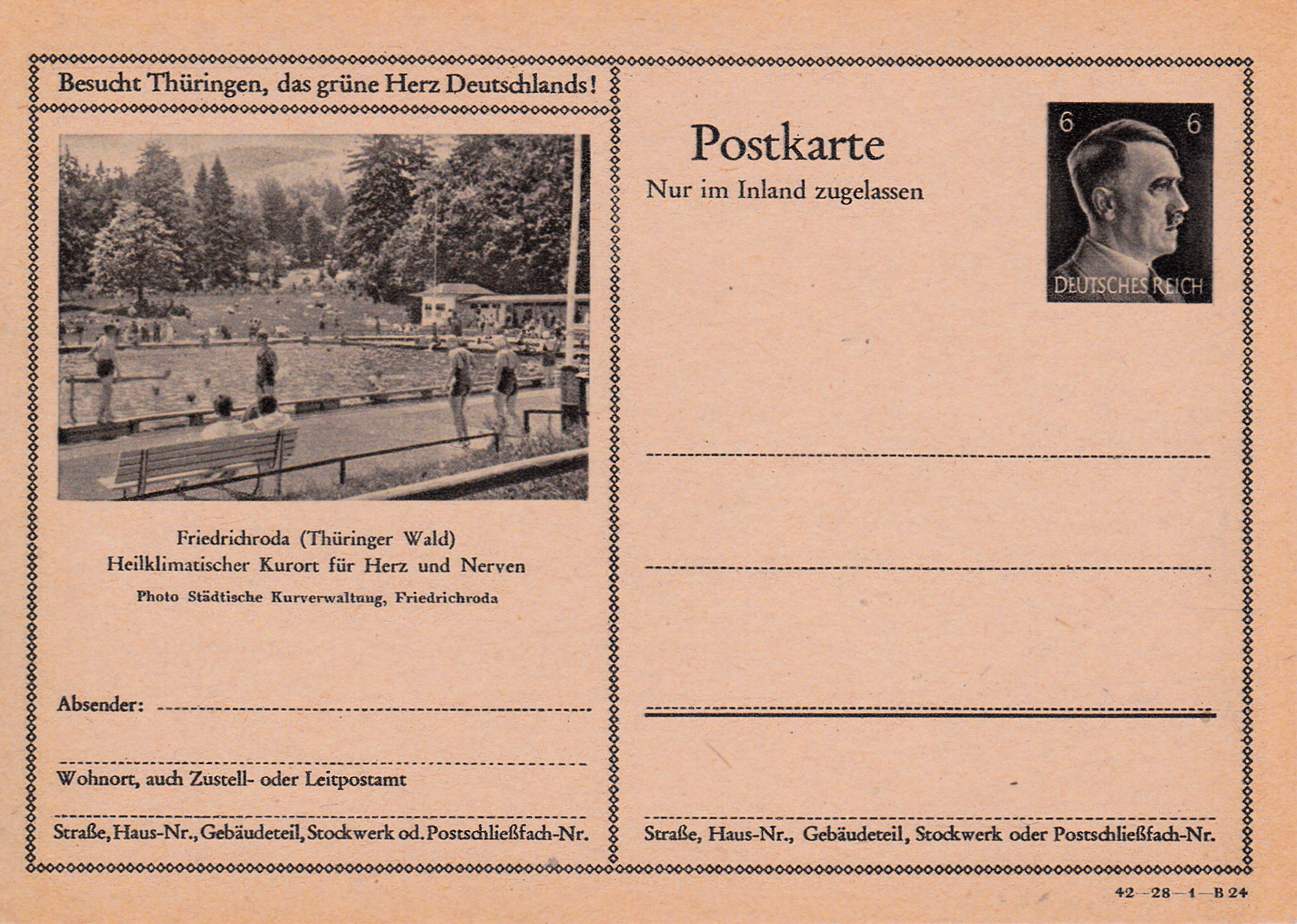 Friedrichroda (Thüringer Wald) ist mit dieser Bildpostkarte 1942 (Serie 28 Bild 22) mit seinem Freibad wie in den vorangegangenen Jahren wieder dabei.