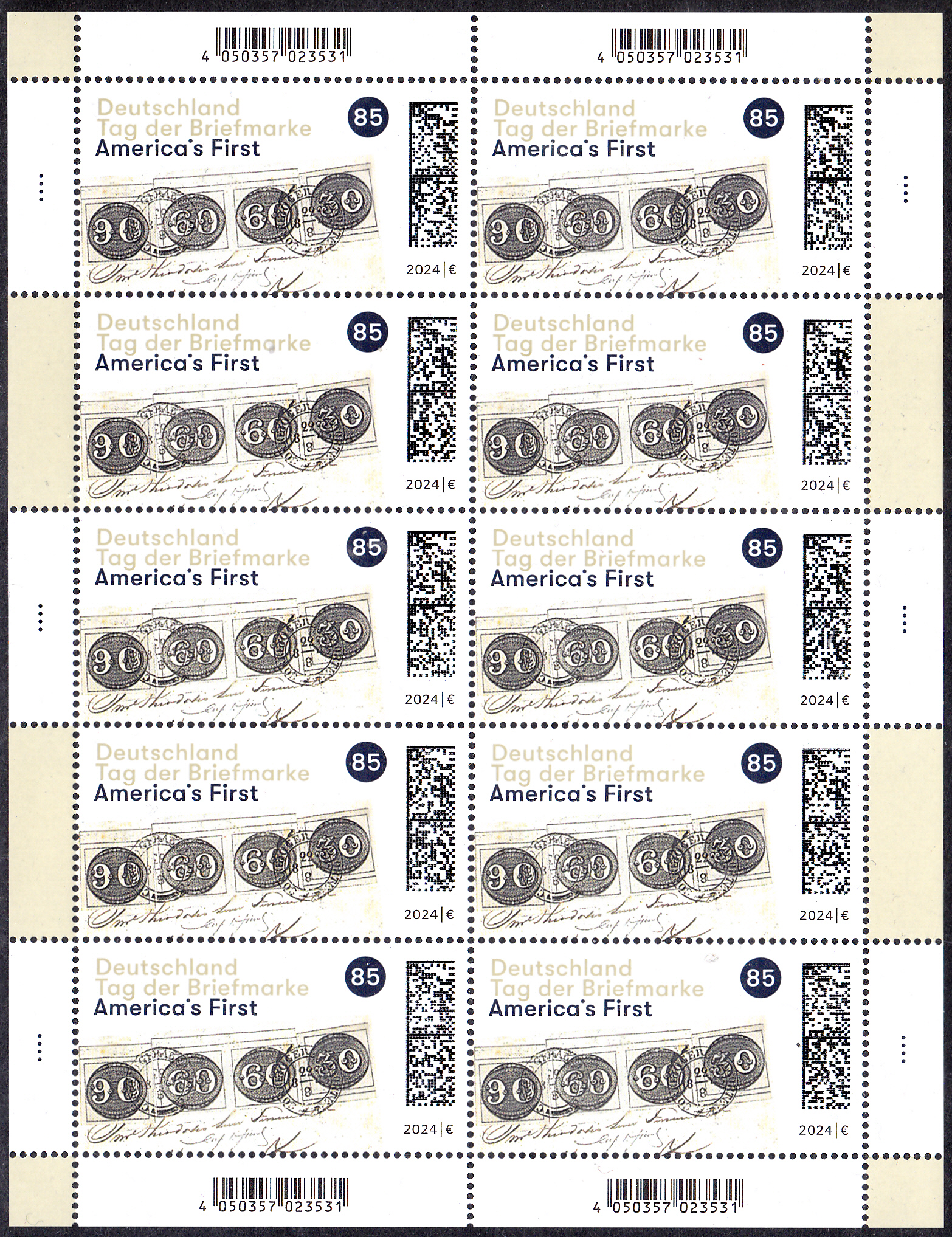 Die Marke zum Tag der Briefmarke 2024 wurde auch in einem Block (MiNr Block 93) gedruckt. Auf dem Blockrand werden ein weiterer Teil des Briefes aus der Sammlung Luis Alemanys mit Brasilien MiNr. 1 bis 3, gelaufen von Rio de Janeiro nach Santos, ein Beschreibungstext und eine Skizze des Seeweges sowie ein Segelschiff gezeigt.