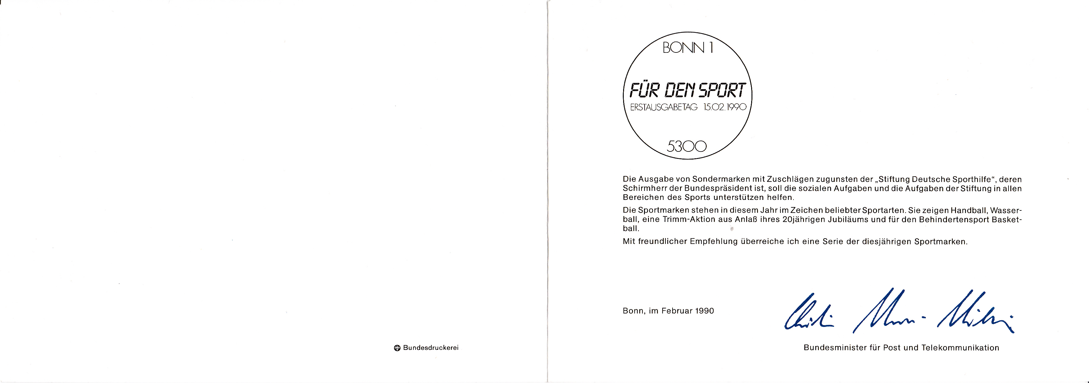 Ministerkarte des Bundesministers für Post und Telekommunikation mit je einer Marke "Für den Sport" 1990. Zusätzlich enthält die Karte auch die beiden Marke aus Berlin. Alle Marken wurden mit dem Ersttagsonderstempel Bonn gestempelt.