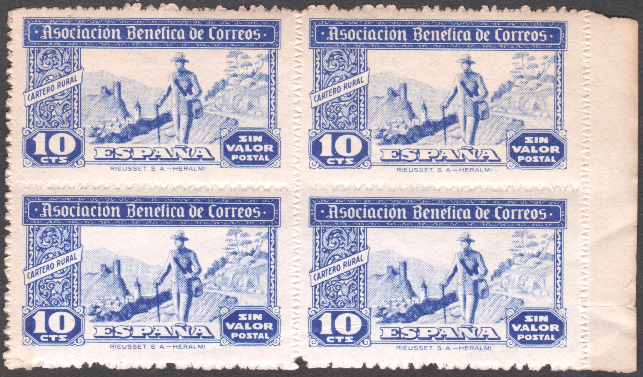 Bei diesem Viererblock aus Spanien handelt es sich nicht um Postwertzeichen, sondern um "Cinderellas", sofort zu erkennen an der Inschrift "SIN VALOR POSTAL":