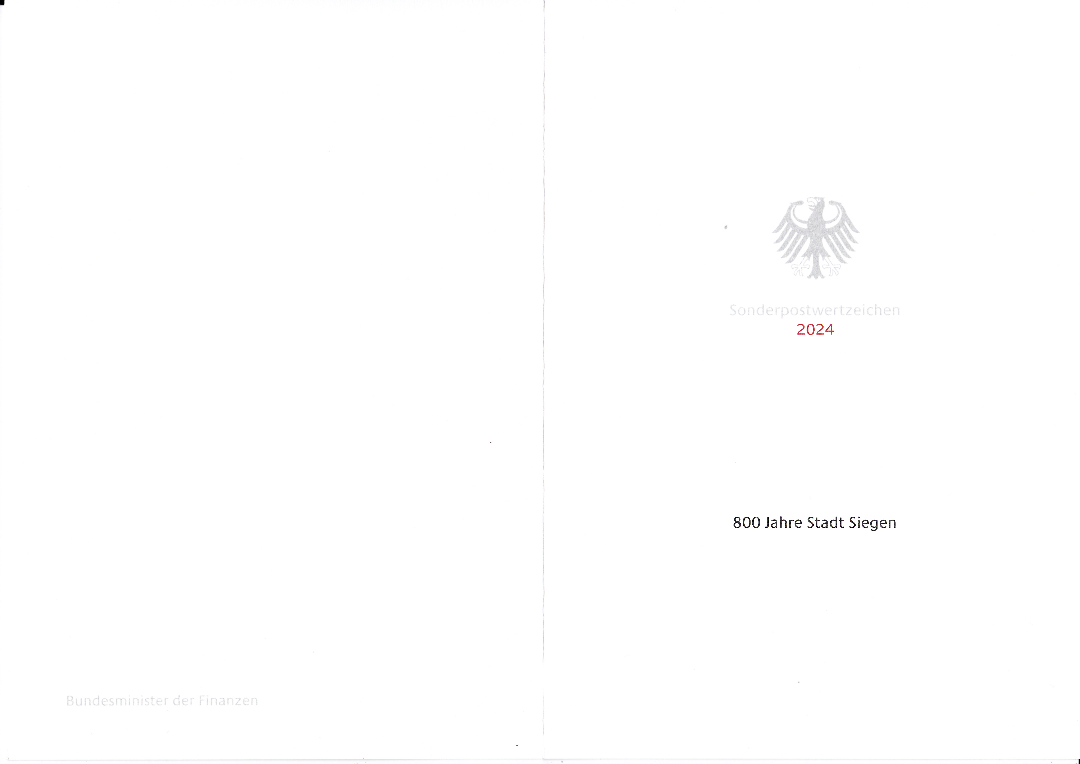 Ministerkarte des Bundesministers für Finanzen mit zwei Marken (MiNr 3823) "800 Jahre Stadt Siegen" und den beiden Ersttagsonderstempel Bonn und Berlin.