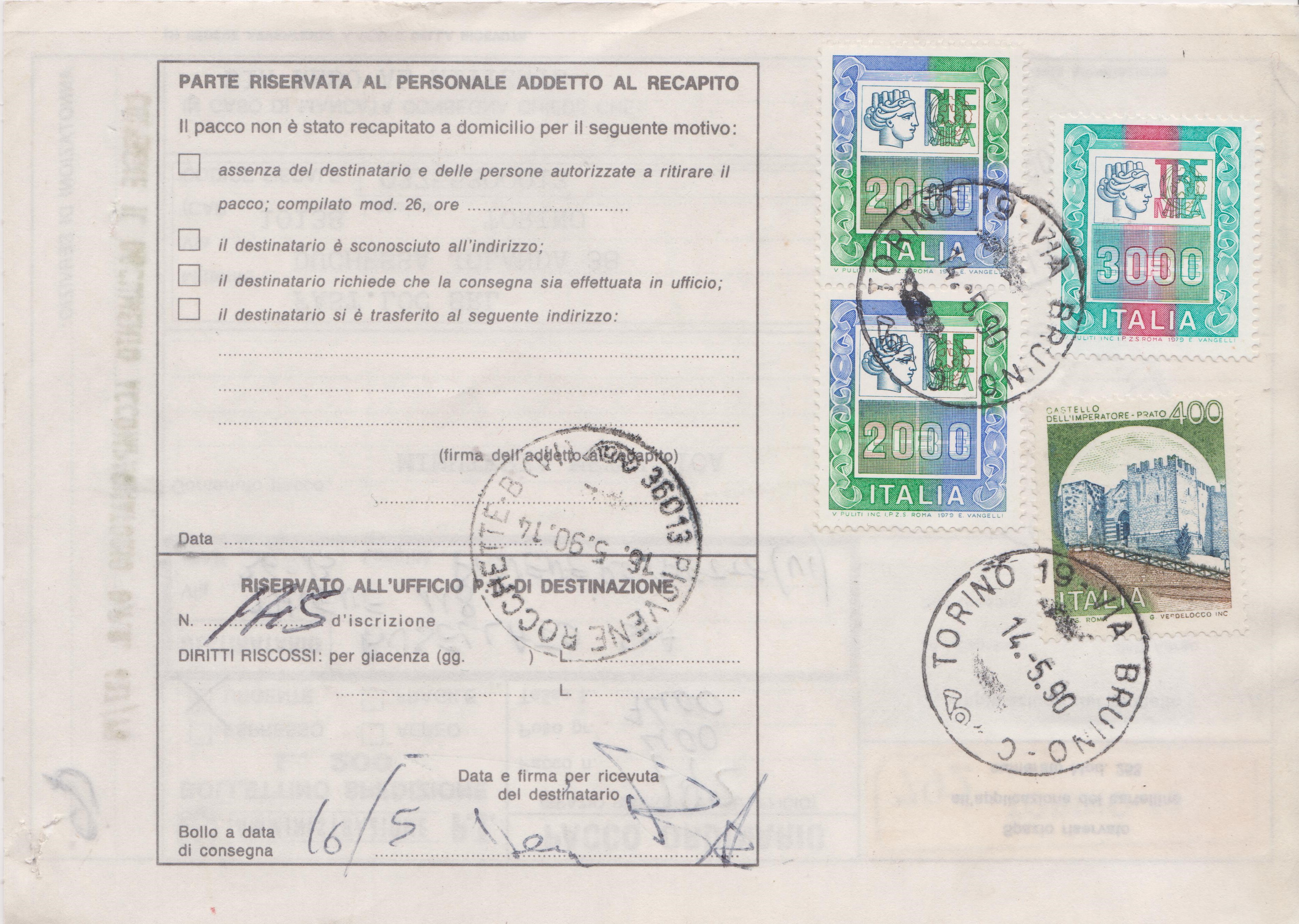 BOLLETTINO SPEDIZIONE = Einlieferungsschein zu einer Eilsendung, die am 14.05.1990 in TORINO 19 = Turin in Italien aufgegeben wurde: