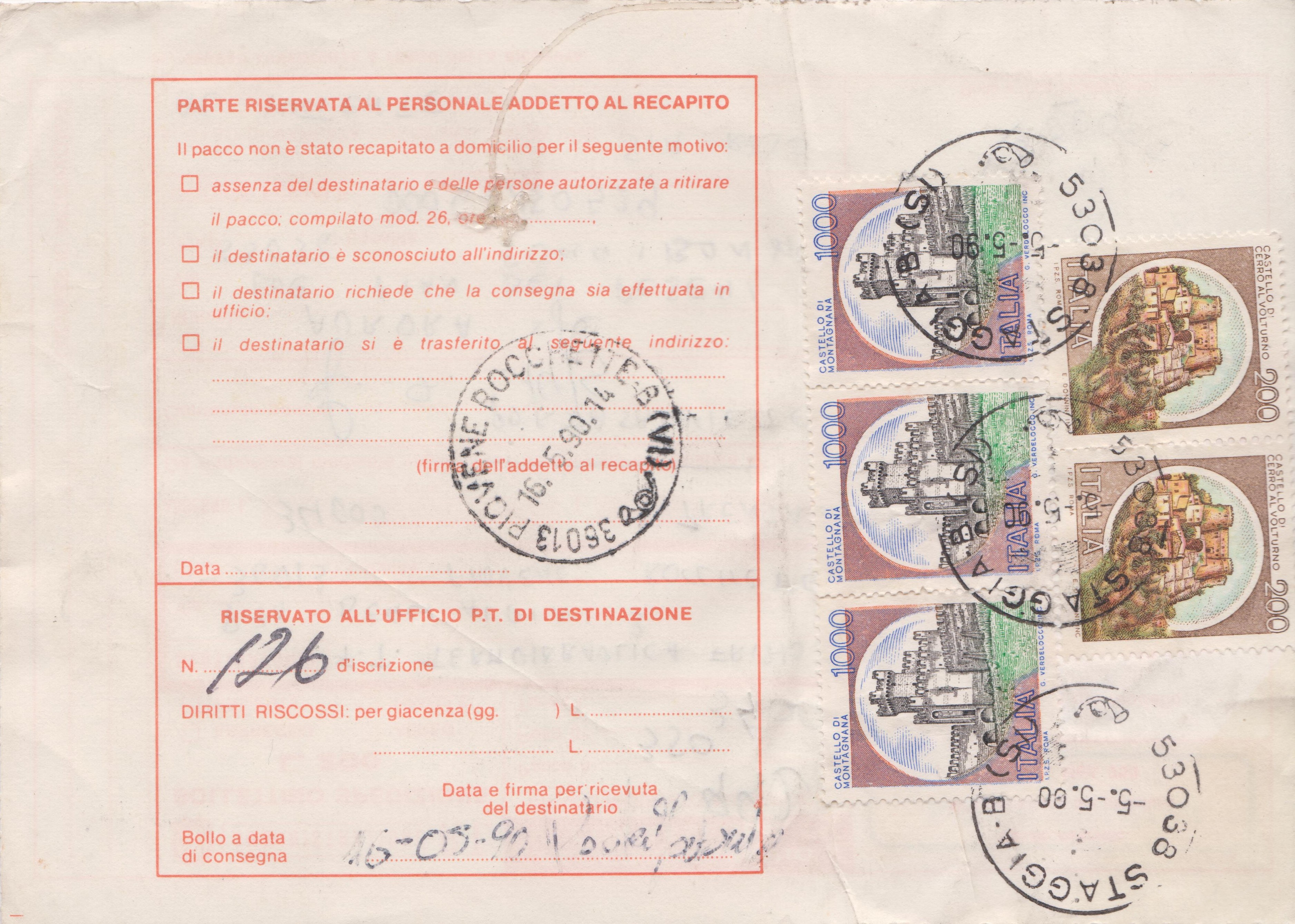 BOLLETTINO SPEDIZIONE = Einlieferungsschein zu einer eingeschriebenen Sendung, die am 05.05.1990 in 53038 STAGGIA in Italien aufgegeben wurde:
