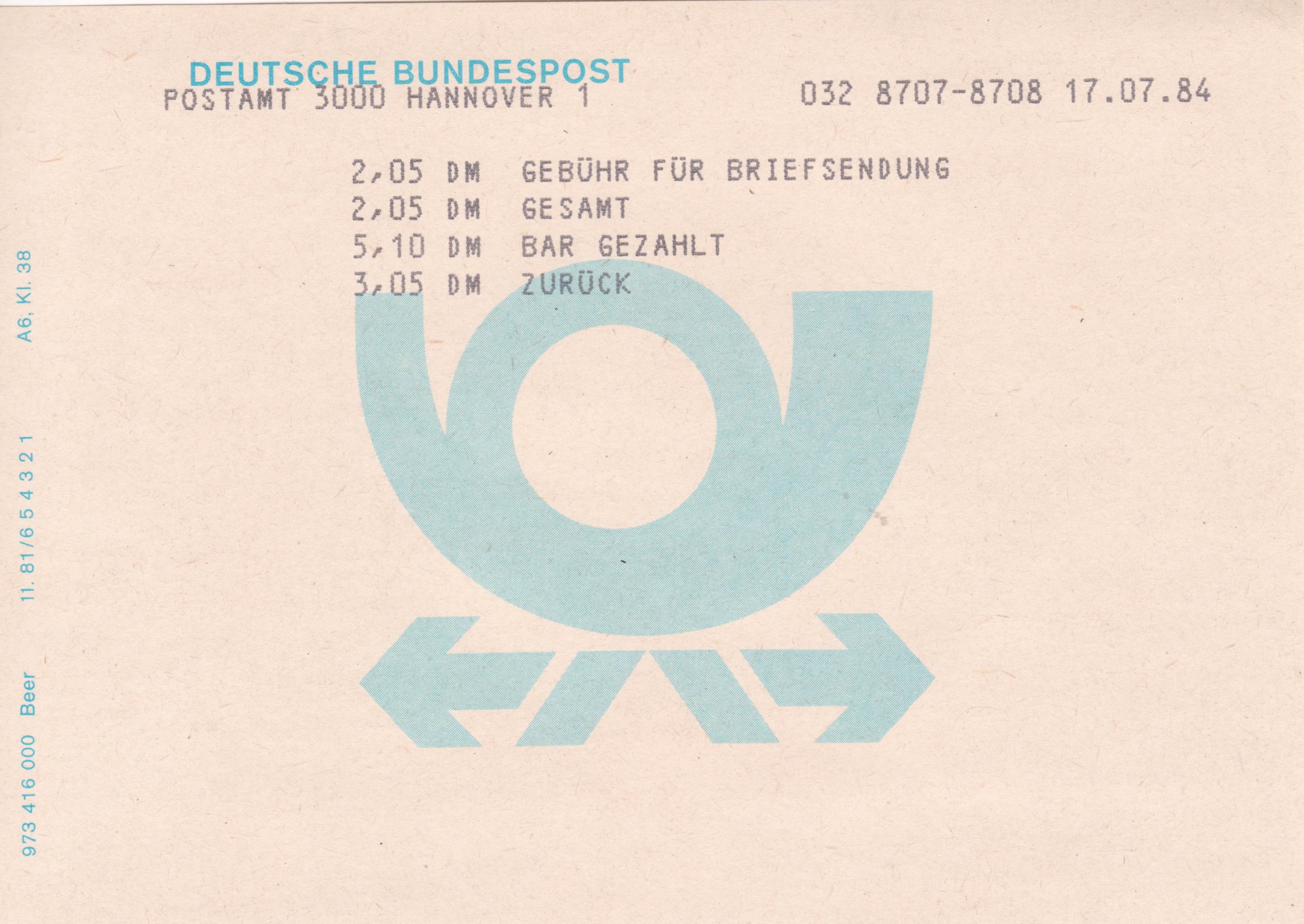 Das auf diesem Beleg verklebte Porto entspricht dem vom 01.07.1990 bis zum 31.03.1991 geltenden Sondertarif VGO von 50 Pf für einen Brief sowie 150 Pf für ein Einschreinen!