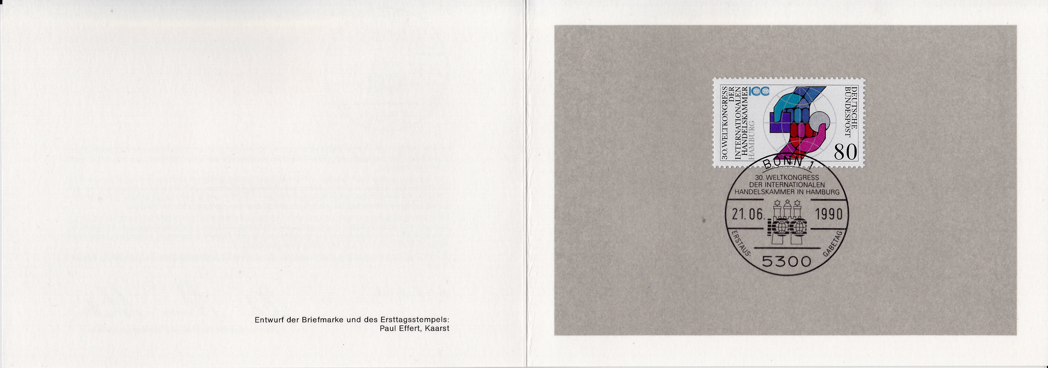 Ministerkarte des Bundesministers für Post und Telekommunikation mit einer Marke (MiNr 1471) "30. Weltkongress der Internationalen Handelskammer (IHK) in Hamburg" und dem Ersttagsonderstempel Bonn.