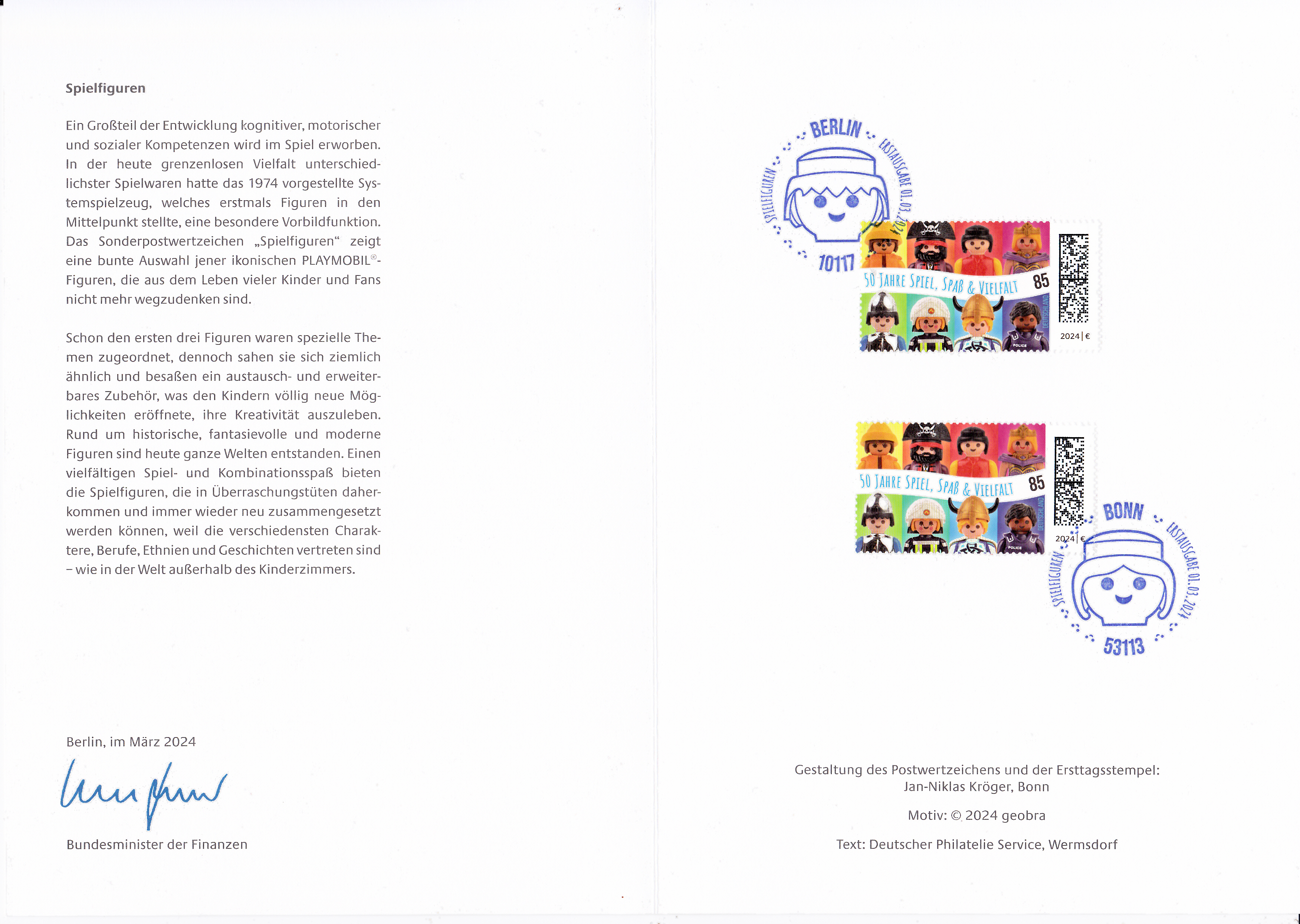 Ministerkarte des Bundesministers für Finanzen mit zwei Marken (MiNr 3820) "50 Jahre Playmobil" und den beiden Ersttagsonderstempel Bonn und Berlin.