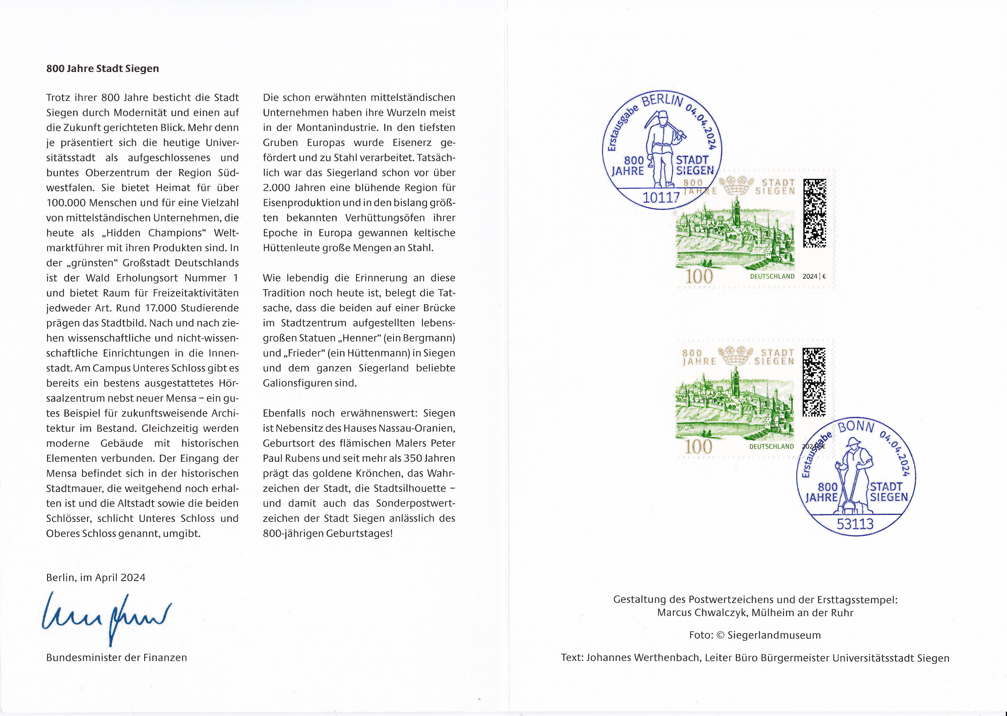 Ministerkarte des Bundesministers für Finanzen mit zwei Marken (MiNr 3823) "800 Jahre Stadt Siegen" und den beiden Ersttagsonderstempel Bonn und Berlin.