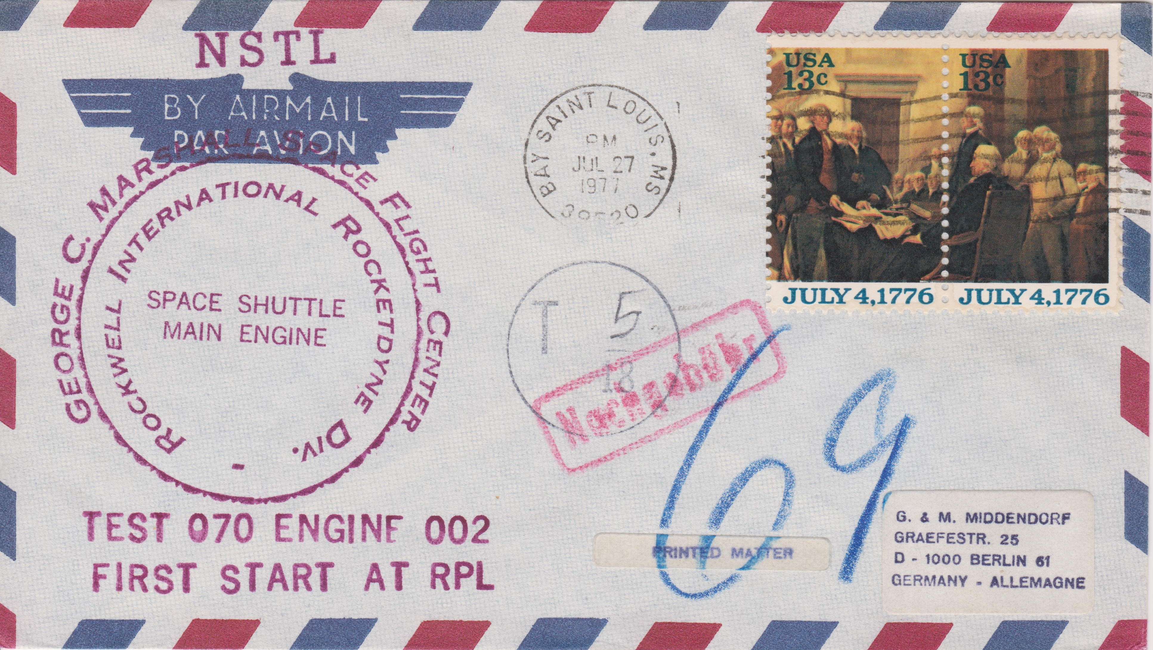 Diese nach Deutschland adressierte Drucksache per Luftpost, aufgegeben am 27.07.1977 in BAY SAINT LEWIS, MS, dokumentiert den "TEST 070 ENGINE 2" der "SPACE SUTTLE MAIN ENGINE":
