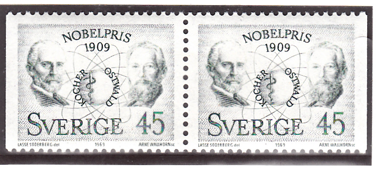 In Schweden ist 1969 eine Marke (MiNr 662) erschienen, die links auf der Marke auch ein Porträt von Theodor Kocher zeigt. Hier ein Paar aus dem Markenheftchen (662Dl/662Dr).