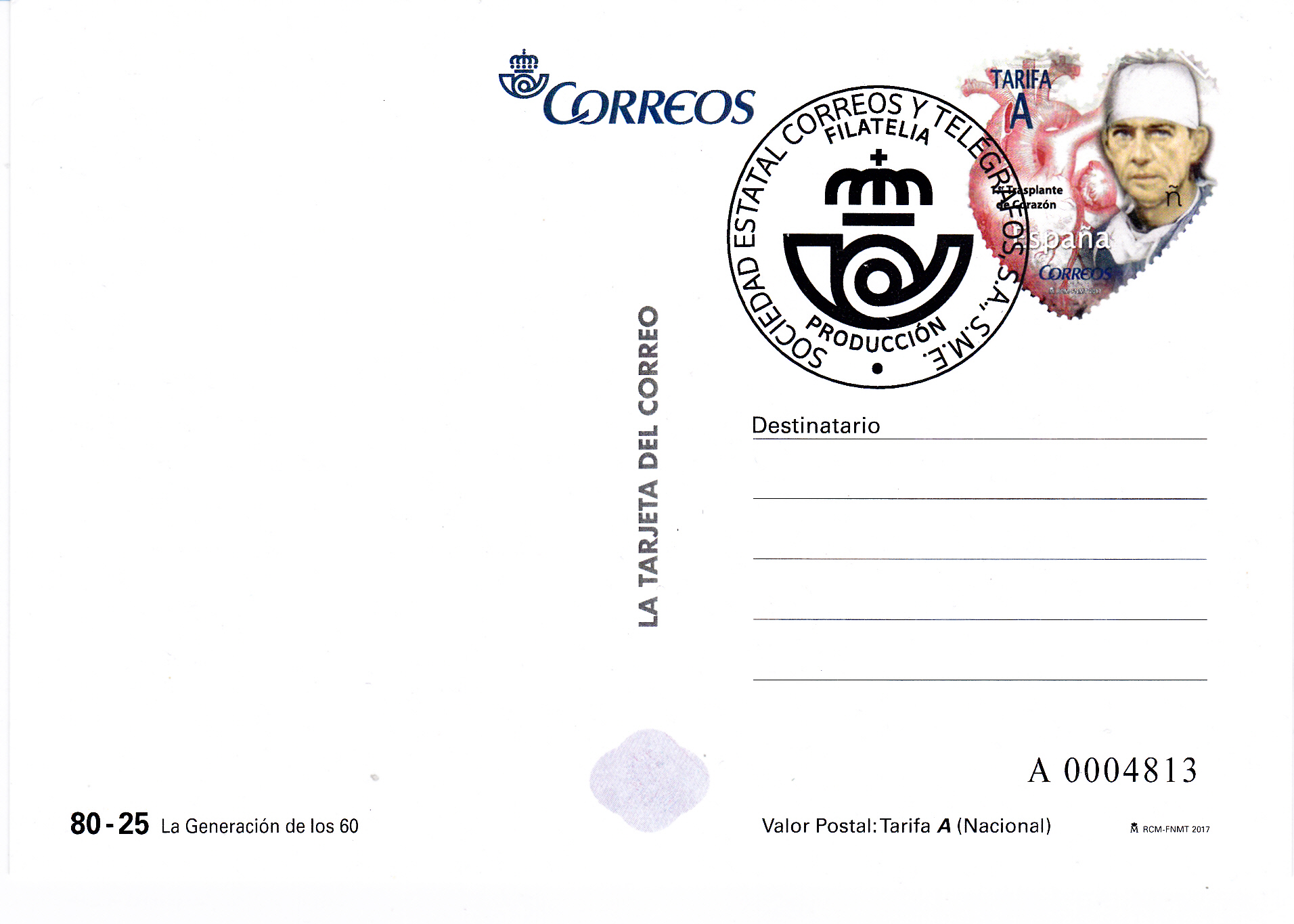 Diese Ganzsachen-Postkarte trägt einen Wertstempel im Muster der im Block "Generation der 1960er" aus Spanien (MiNr Block 295 mit den Marken MiNr 5178 bis 5181) enthaltenen Marke zu 0,50€ (MiNr 5178) mit dem Porträt von Christiaan Barnard und einem menschlichen Herz.
