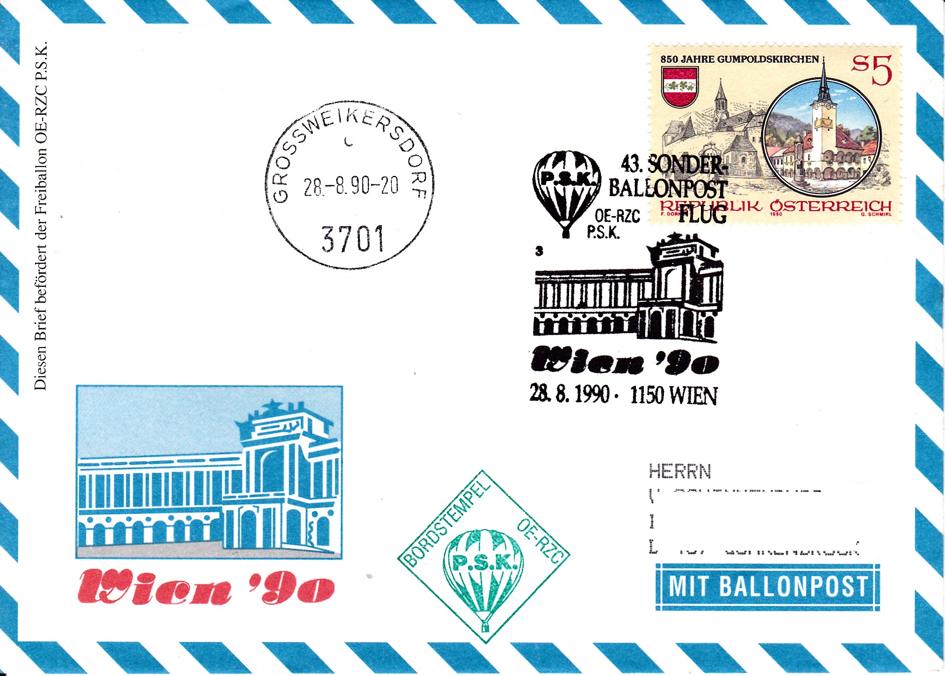 Diese Karte wurde am 8.2.2000 bei der UN-Postverwaltung Wien für den 103. Ballonpostflug der Österreichischen Pro Juventute mit dem Ballon OE-MZL Landleben aufgegeben und mit dem Tagesstempel mit dem Kennbuchstaben "w" gestempelt. Am 3.3.2000 wurde sie mit dem Ballon OE-MZL Landleben befördert. Die Karte erhielt an diesem Tag den Sonderstempel aus Graz mit der Kennziffer "1" zu diesem 103. Ballonpostflug, einen Tagesstempel aus St. Rupprecht an der Raab mit dem Kennbuchstaben "c" und einen Bordstempel.