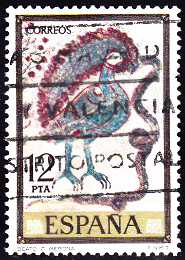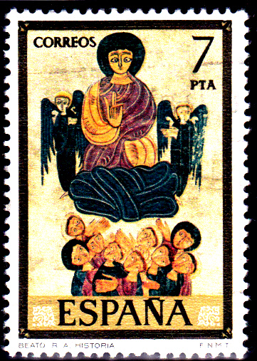 Zum Tag der Briefmarke 1975 erschien in Spanien am 29.9.1975 eine Serie mit acht Marken mit Miniaturen aus alten Handschriften. Aus dieser Serie kann ich hier den Wert zu 7 Ptas (MiNr 2182) mit dem Bild "Engel und Gläubige" zeigen.