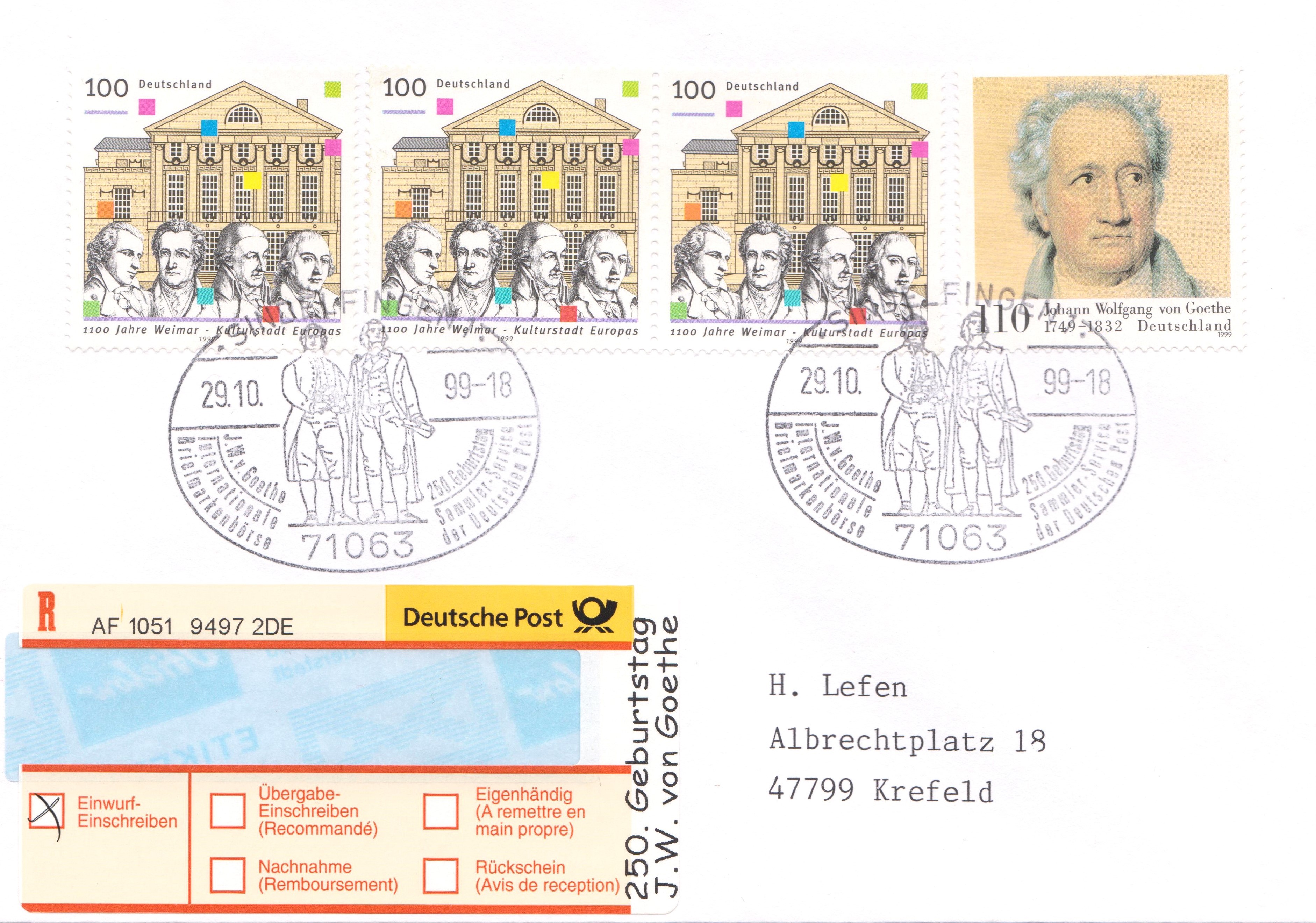 R-Brief mit Sonderlabel "250. Geburtstag J. W. von Goethe", Nummer AF 1051 9497, aufgegeben am 29.10.1999 in SINDELFINGEN: