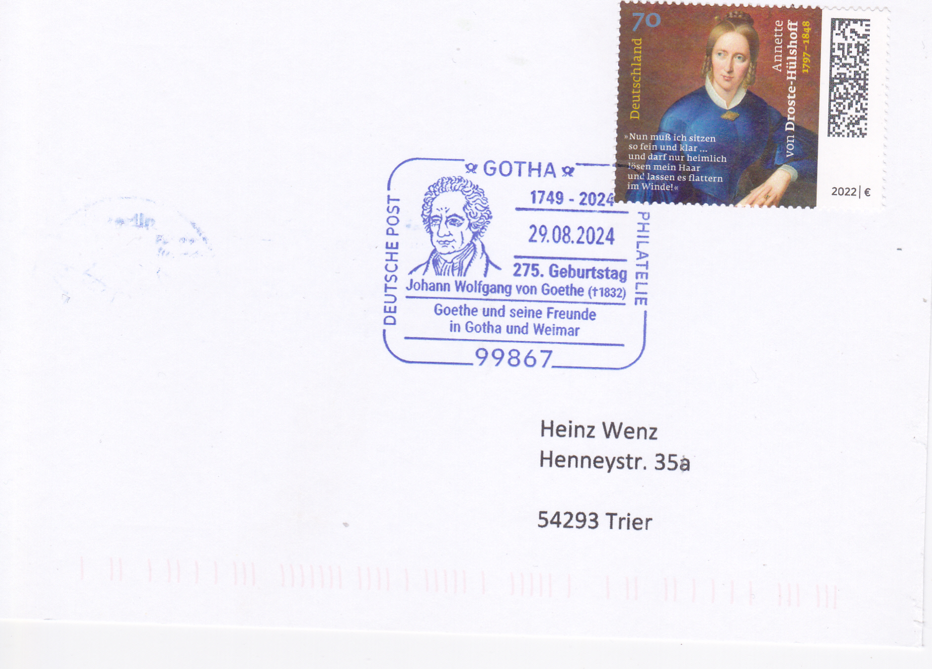 Sonderstempel vom 29.8.2024 aus Gotha zum 275. Geburtstag von Johann Wolfgang von Goethe.