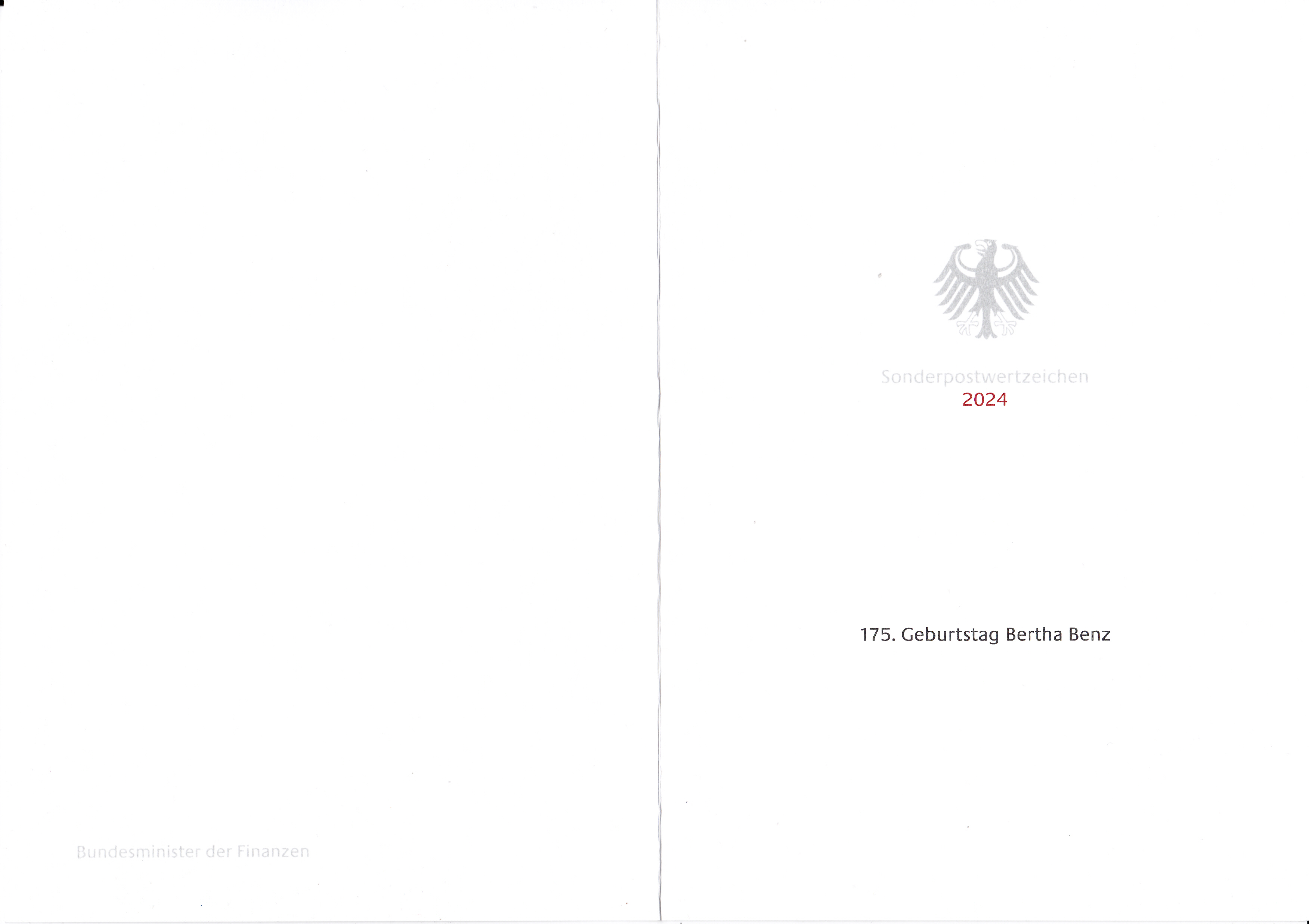 Ministerkarte des Bundesministers für Finanzen mit zwei Marken (MiNr 3829) zum 175. Geburtstag von Bertha Benz und den beiden Ersttagsonderstempel Bonn und Berlin.